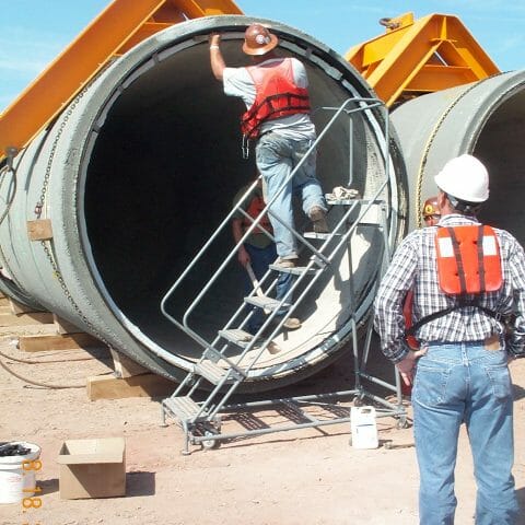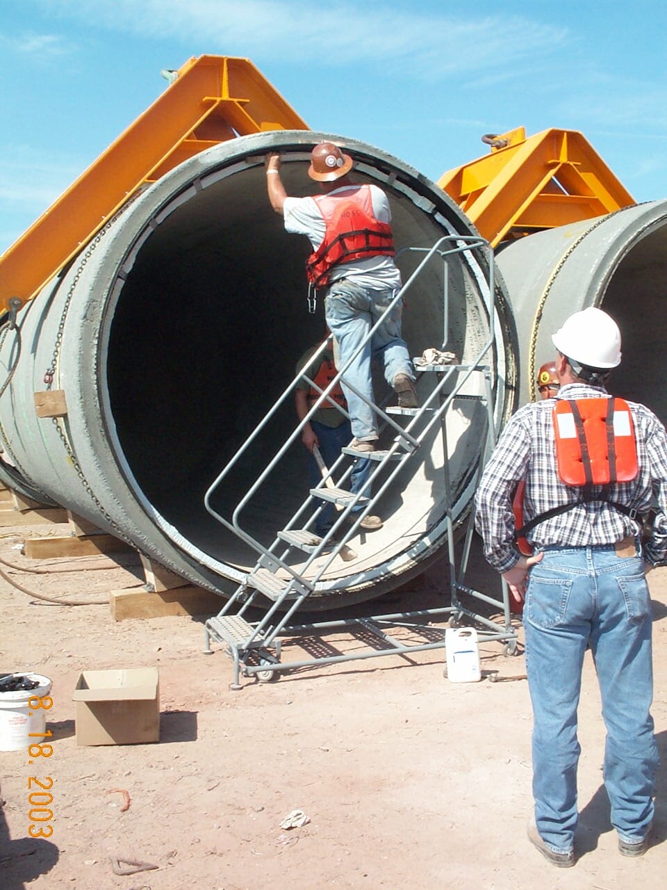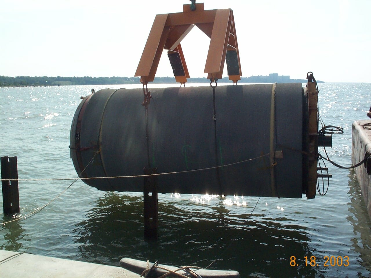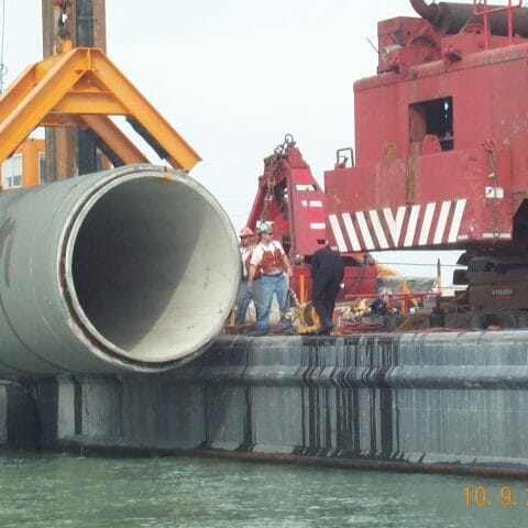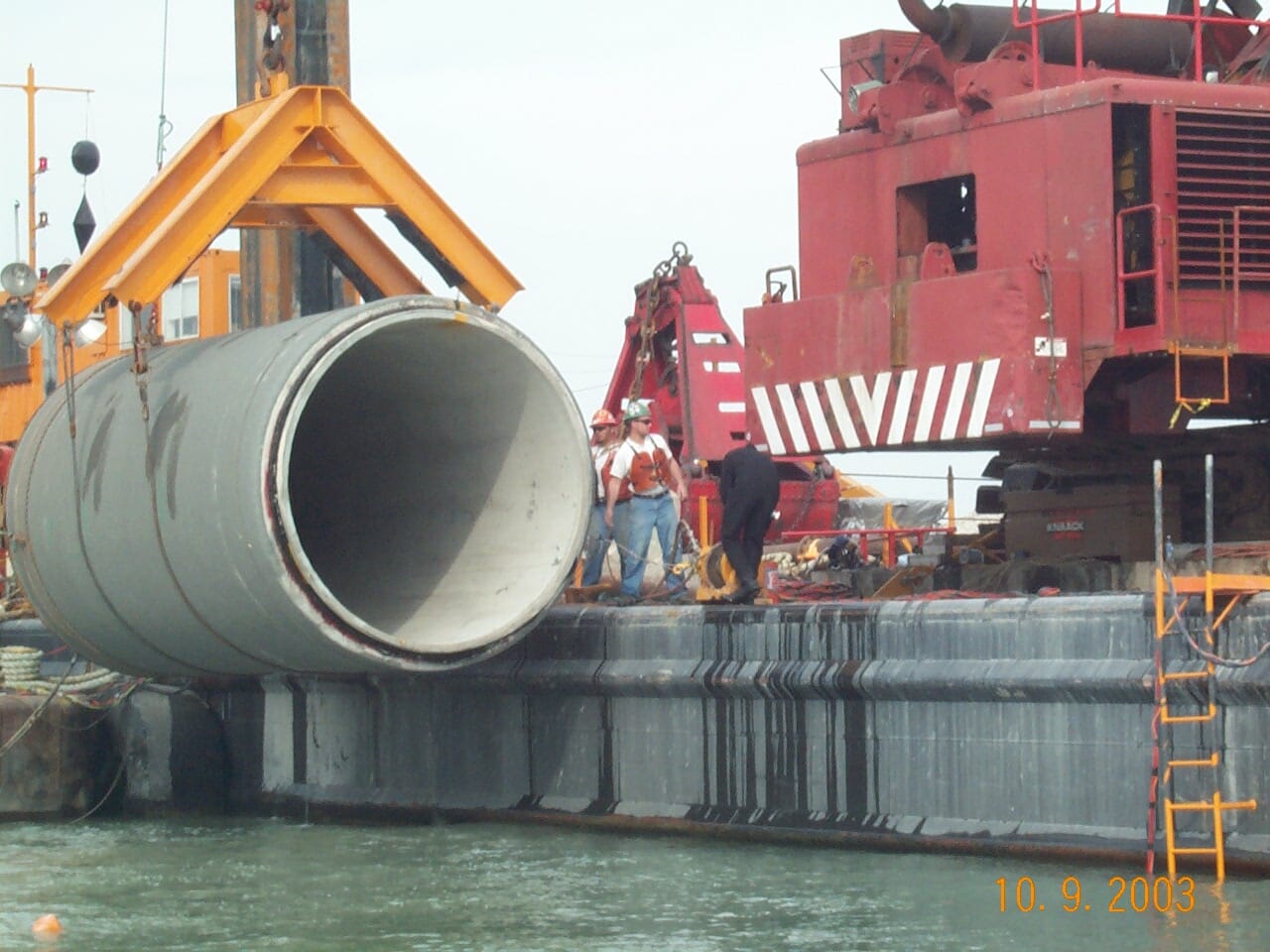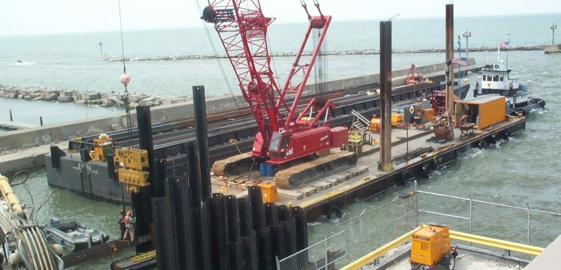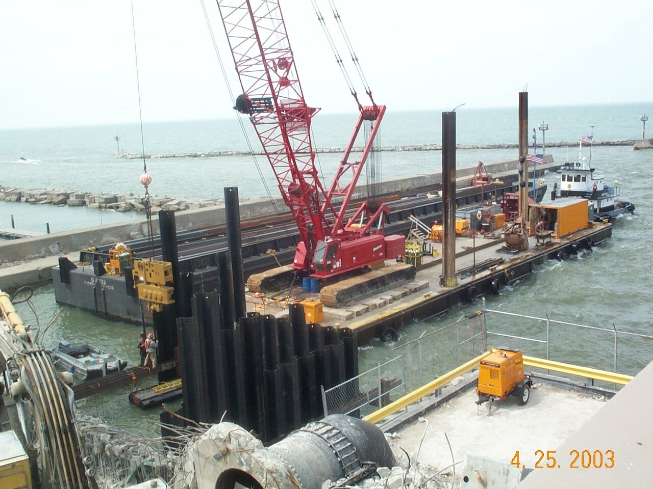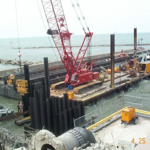 UPGRADING THE CITY’S SEWAGE SYSTEM Durocher Marine installed 4,750 ft of 108” diameter concrete pipe to extend the City of Cleveland’s Westerly Treatment Plant’s sewer outfall into Lake Erie. INSIDE THE PROJECT The City of Cleveland upgraded their Westerly Sewage Treatment Plant. This included a 4,750 ft pre-stressed concrete cylinder pipeline to convey treated effluent out into the open lake. The pipeline project started near shore at the treatment plant that was demolished and rebuilt. The project had several unique features. At the start was a drop structure that housed the vertical component of the outfall. This structure required sheeting the outside face of the dockwall to create a cofferbox, which required dredging the area to grade. As the cofferbox was dredged, a series of internal braces were lowered and installed to prevent the structure from collapsing. Once dredged, 40 vertical Hpile were driven into the base of the structure. The Hpile were cut off below water, and a 4 ft thick reinforced cap was placed. Once the concrete cured, the cofferbox could be dewatered and the internal piping was added. The area from the cofferbox to the open lake required 900 ft of sheeted pipe trench with wales and bracing. The top 6 ft of material was contaminated and required upland disposal. The remaining material was dredged and reused as backfill. Once dredged, the pipeline connected to the cofferbox and was installed to the end of the sheeted trench and backfilled. The sheets were cut off at the elevation of the top of pipe and left in place. At the end of the sheeted trench, a temporary sheet pile structure was installed. This allowed us to remove 300 ft of existing breakwall and install 300 ft of pipe, which got the pipe outside the breakwall. Once this section of pipeline was complete, the breakwall was replaced and the temporary cells were removed. This allowed for the remaining 3,500 ft of open lake trench to be excavated, the pipe installed, and backfilled. WHY IT MATTERS The existing outfall structure was undersized to handle the amount of effluent required. By rebuilding the plant and expanding the outfall, they gained capacity for the future and made the byproduct cleaner. BEYOND THE PROJECT This was Durocher Marine’s first project as Kokosing. It brought Durocher Dock and Dredge together with Kokosing. PROJECT DETAILS: Project Name: Cleveland Outfall DCP_0825 DCP_1170 DCP_1188 DCP_1306 Pile 02 Close DCP_0825 DCP_1170 DCP_1188 DCP_1306 Pile 02
