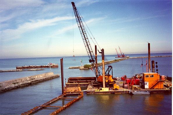 Marine Cleveland Outfall > Projects > Subaqueous Outfall Installation, Cleveland, OH UPGRADING THE CITY’S SEWAGE SYSTEM Durocher Marine installed 4,750 ft of 108” diameter concrete pipe to extend the City of Cleveland’s Westerly Treatment Plant’s sewer outfall into Lake Erie. INSIDE THE PROJECT The City of Cleveland upgraded their Westerly Sewage Treatment Plant. This included a 4,750 ft pre-stressed concrete cylinder pipeline to convey treated effluent out into the open lake. The pipeline project started near shore at the treatment plant that was demolished and rebuilt. The project had several unique features. At the start was a drop structure that housed the vertical component of the outfall. This structure required sheeting the outside face of the dockwall to create a cofferbox, which required dredging the area to grade. As the cofferbox was dredged, a series of internal braces were lowered and installed to prevent the structure from collapsing. Once dredged, 40 vertical Hpile were driven into the base of the structure. The Hpile were cut off below water, and a 4 ft thick reinforced cap was placed. Once the concrete cured, the cofferbox could be dewatered and the internal piping was added. The area from the cofferbox to the open lake required 900 ft of sheeted pipe trench with wales and bracing. The top 6 ft of material was contaminated and required upland disposal. The remaining material was dredged and reused as backfill. Once dredged, the pipeline connected to the cofferbox and was installed to the end of the sheeted trench and backfilled. The sheets were cut off at the elevation of the top of pipe and left in place. At the end of the sheeted trench, a temporary sheet pile structure was installed. This allowed us to remove 300 ft of existing breakwall and install 300 ft of pipe, which got the pipe outside the breakwall. Once this section of pipeline was complete, the breakwall was replaced and the temporary cells were removed. This allowed for the remaining 3,500 ft of open lake trench to be excavated, the pipe installed, and backfilled. WHY IT MATTERS The existing outfall structure was undersized to handle the amount of effluent required. By rebuilding the plant and expanding the outfall, they gained capacity for the future and made the byproduct cleaner. BEYOND THE PROJECT This was Durocher Marine’s first project as Kokosing. It brought Durocher Dock and Dredge together with Kokosing. PROJECT DETAILS: Project Name: Cleveland Outfall DCP_0825 DCP_1170 DCP_1188 DCP_1306 Pile 02 Close DCP_0825 DCP_1170 DCP_1188 DCP_1306 Pile 02