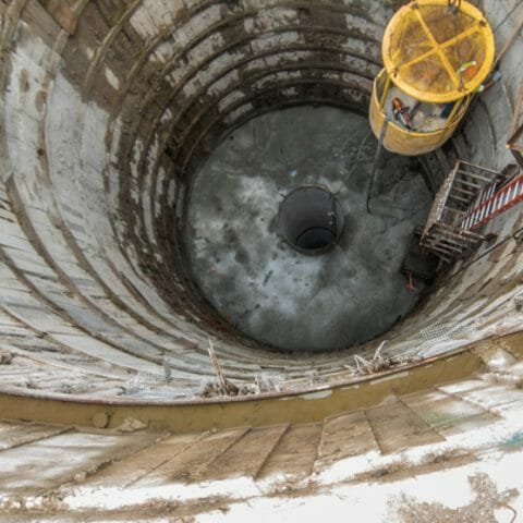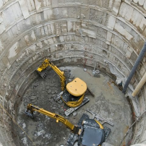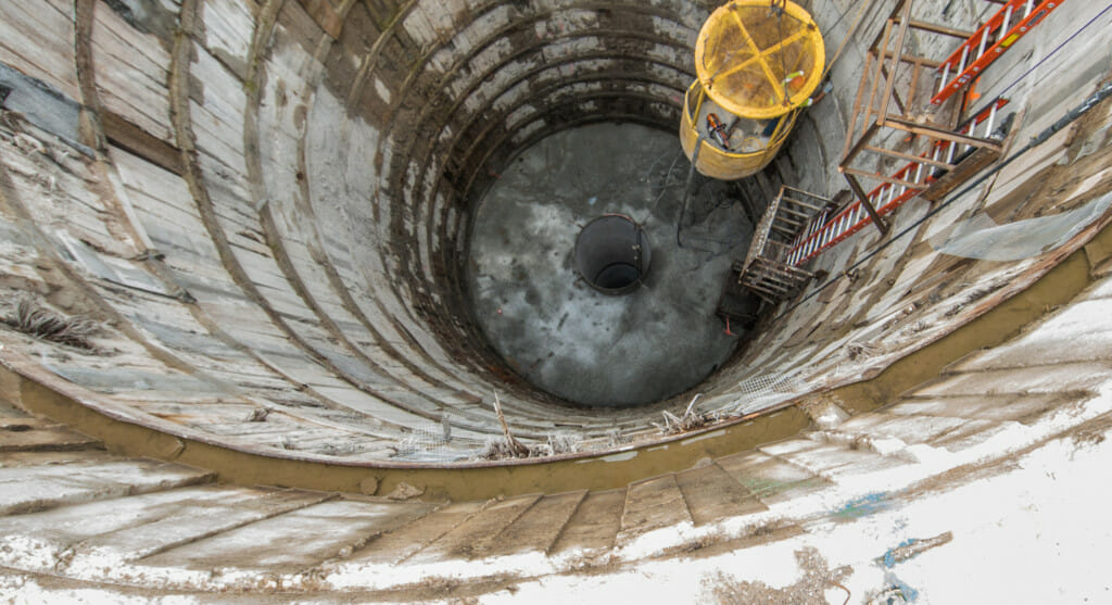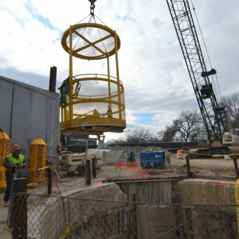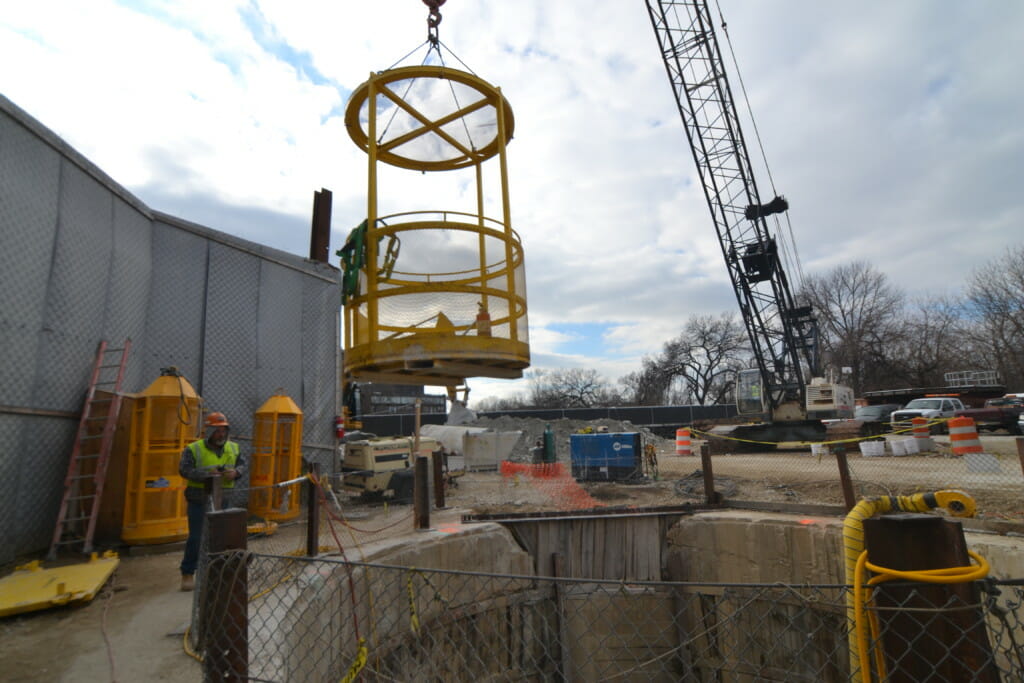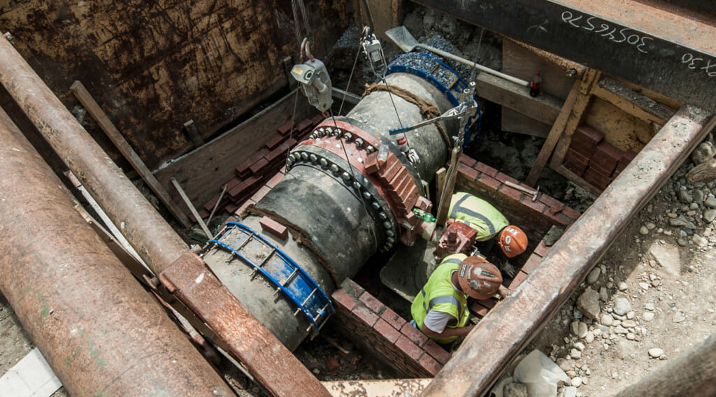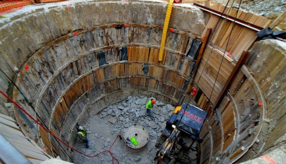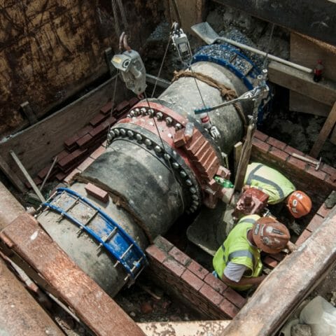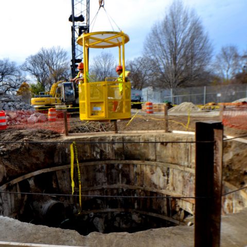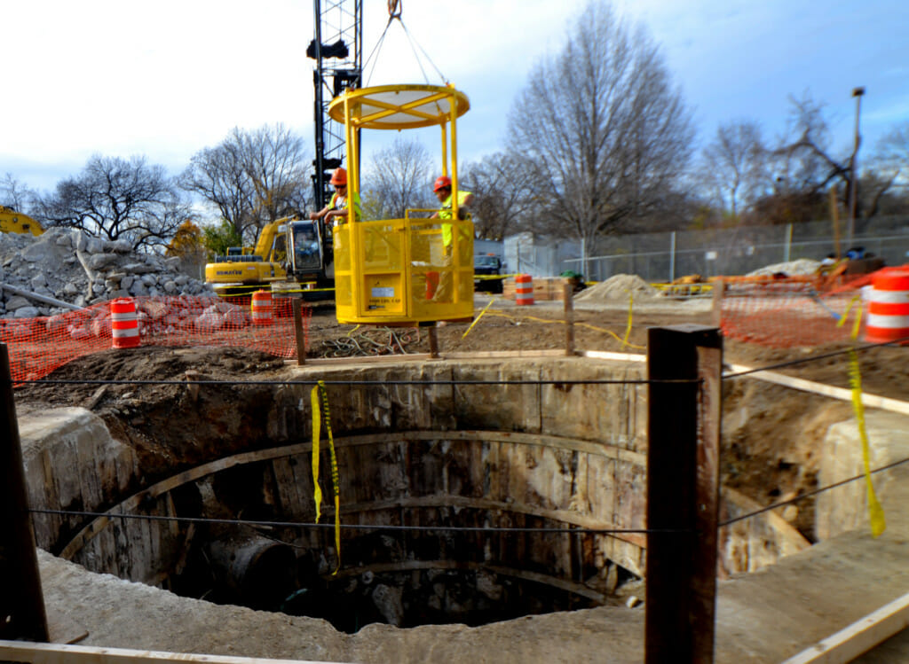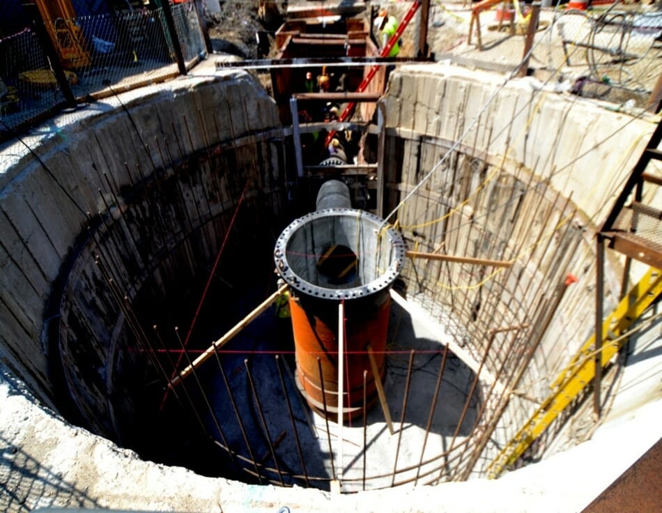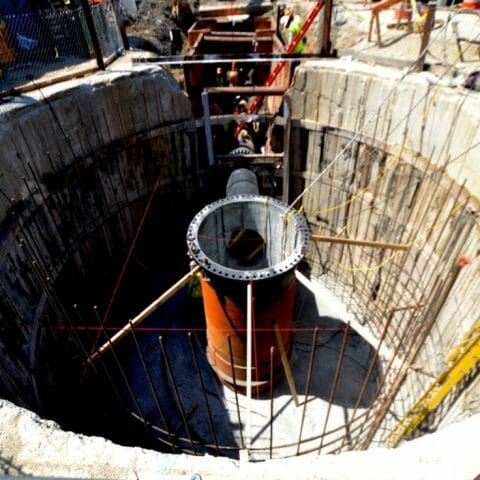 KEY CHALLENGES & PROJECT DETAILS Over time, the Cross Town Tunnel developed leakage where it passed beneath Rock Creek near the access shaft at 25th & N Streets, NW. Corman installed a 75 in. steel liner within the tunnel that spans the leakage points. The lower end site at Foxhall and Massachusetts Avenues was used for ventilation, dewatering, structure modifications, and valve installations. The main work site at 25th & N Streets was used to access the tunnel for pipe installation and structure modifications. Sites were next to urban buildings up to 10 stories high and busy streets. To initiate construction, the tunnel’s water supply was disconnected, the tunnel was isolated from the inflow of water by installing two 72 in. gate valves weighing 50,000 lbs. in the lines leading to the tunnel, and 3.5 million gallons of water were pumped, de-chlorinated and discharged to the C & O Canal nearby. After shaft excavation, a mine shaft personnel/material elevator was erected on the shaft wall for entering/exiting the tunnel during pipe installation. The 75 in. steel liner was installed within the tunnel using a Corman-designed pipe carrier. Procedures for joining the pipe, end bulkheads, and bracing mechanisms were developed in-house by Corman. PROJECT DETAILS: Project Owner: DC Water Location: Washington, DC Close