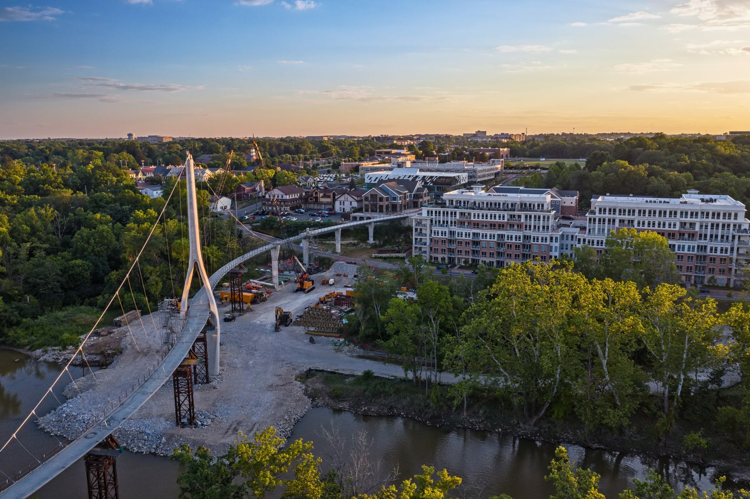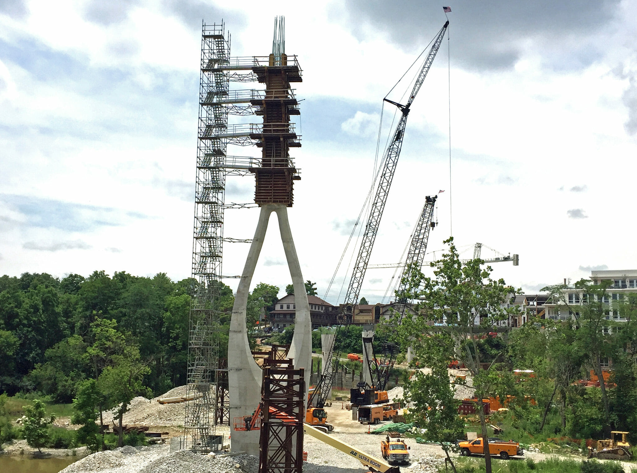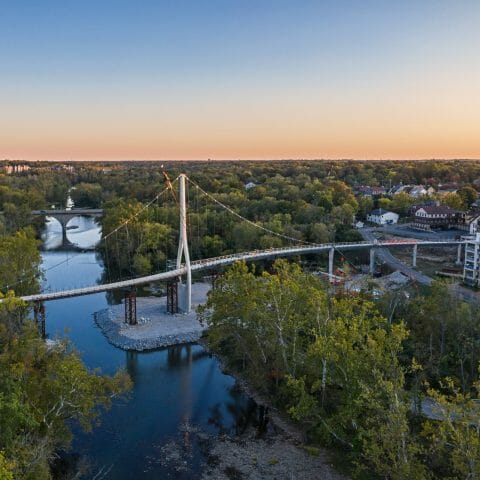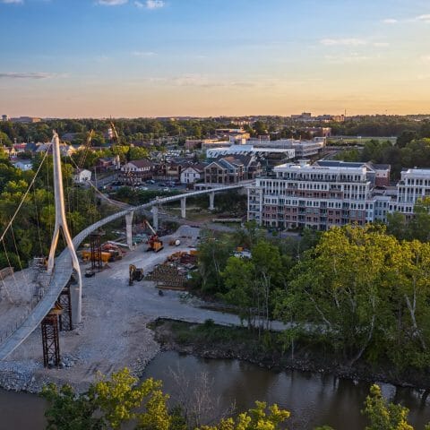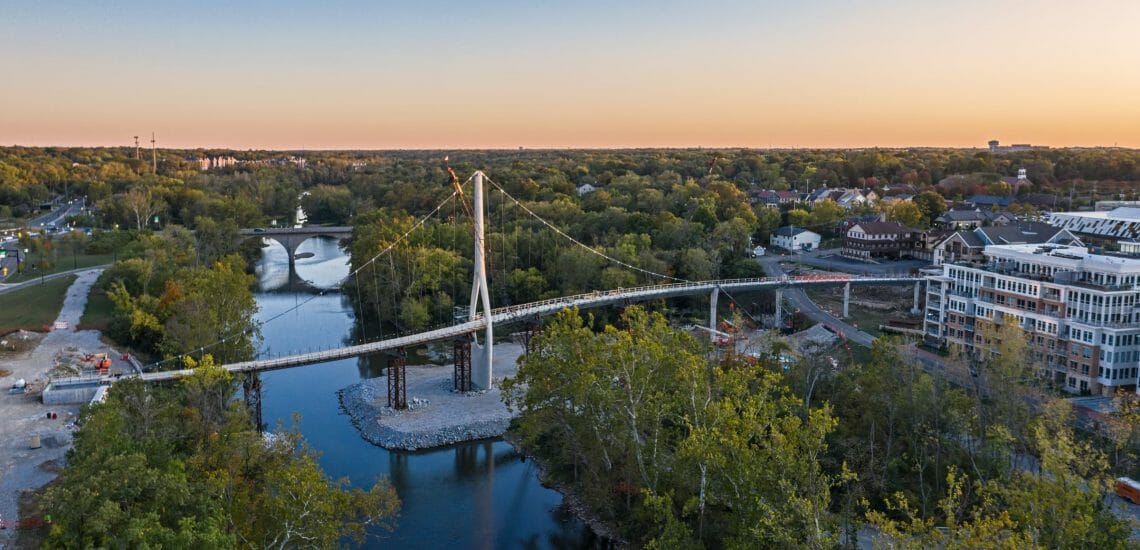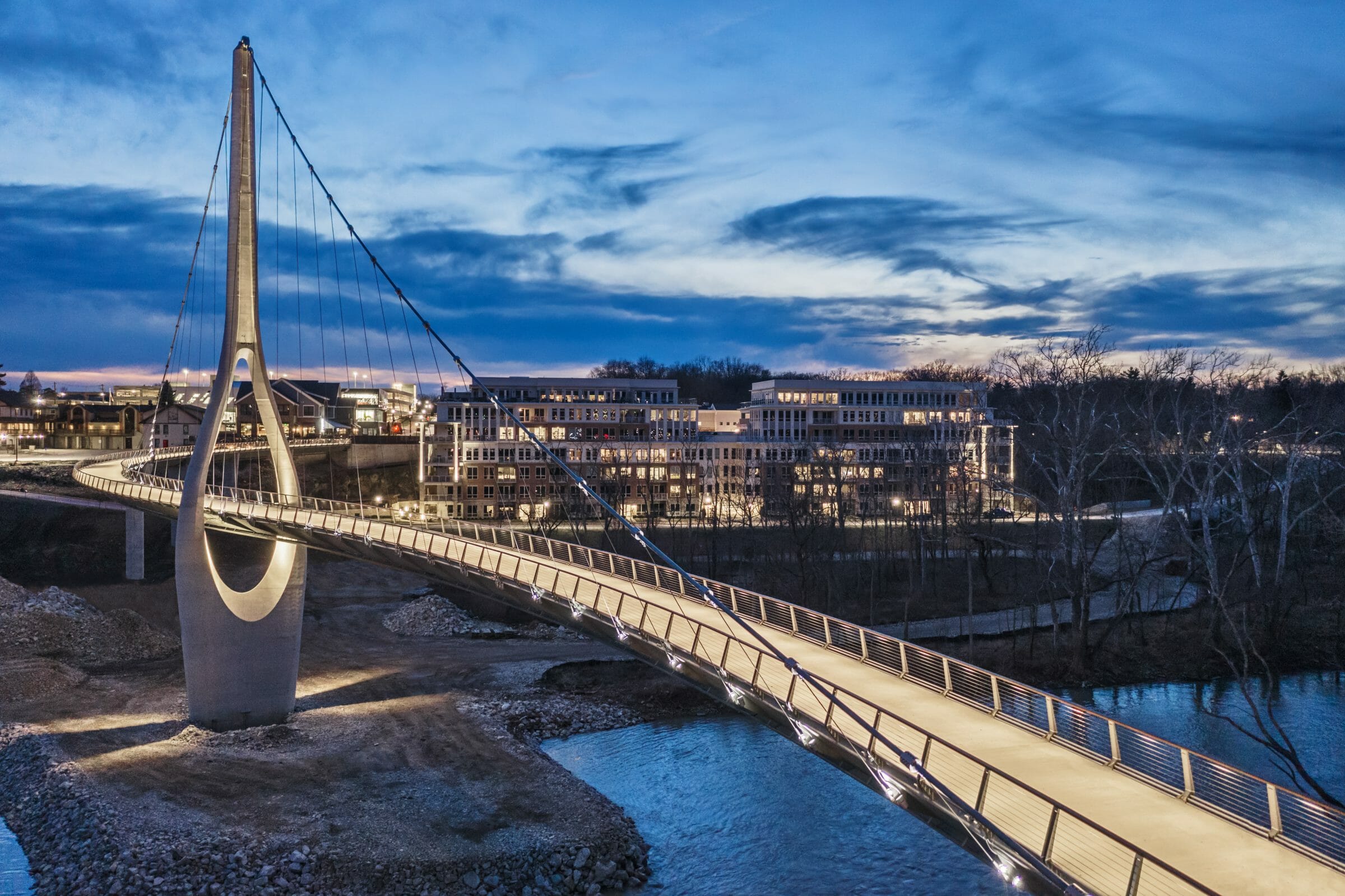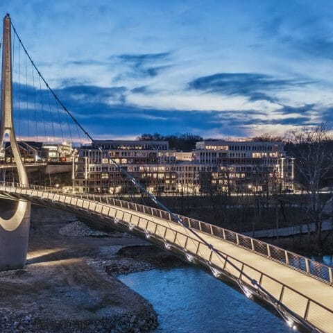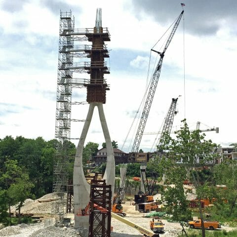 INSIDE THE PROJECT Kokosing served as the Construction Manager/General Contractor (CM/GC) to the City of Dublin, Ohio to construct a new pedestrian and bicycle bridge over the Scioto River. This iconic landmark connects downtown Dublin to the future Riverside Crossing Park. Kokosing began foundation work in May 2017 and self-performed the construction of all bridge foundations, bridge piers, the construction of the 172-feet-tall main pylon that supports the suspension cables, and the bridge deck totaling 2,100-cubic-yards of structural concrete; the installation of 608-feet of 120 mm main cable and 1,727-feet of 21 mm hanger cables, and the installation of 760 feet of variable geometry structural steel triangular box segments. Of the 760-feet-long span, 500-feet is suspended by one main suspension cable on either side of architectural main pylon. Kokosing worked closely with the City of Dublin and designer T.Y. Lin to resolve constructability issues during the plan finalization process. This allowed for savings to the owner along with increased time to develop solutions to the unique challenges that the geometry of the project presented. PROJECT DETAILS: Project Owner: Dublin, Ohio Project Value: $22,100,000 Delivery Method: CMGC CAPABILITIES: Bridges D-B/CMGC EUGENE C. FIGG JR. MEDAL 2021 International bridge Conference Awards (IBC) Learn More 2021 PROJECT OF THE YEAR American Society of Highway Engineers (ASHE) Great Lake Region SOCAL ILLUMINATION AWARD OF MERIT- EXTERIOR 2021 IES Los Angeles and IES Orange County BEST PROJECT 2020 ENR Midwest NO. 2 IN TOP 10 BRIDGES LIST, 2020 Roads and Bridges Learn More BEST BRIDGE/HIGHWAY PROJECT AWARD, 2020 Engineering News-Record (ENR), Midwest Learn More OUTSTANDING PROJECT AWARD, NEW BRIDGES AND TRANSPORTATION STRUCTURES, 2020 National Council of Structural Engineers Association (NCSEA) OUTSTANDING SPECIAL PURPOSE BRIDGE AWARD 2020 Association for Bridge Construction and Design Ohio Chapter (ABCD) Learn More TRANSPORTATION PROJECT OF THE YEAR 2020 Engineers’ Society of Western Pennsylvania (ESWP) Learn More PROJECT OF THE YEAR 2020 ASHE Central Ohio PROJECT OF THE YEAR 2020 ASHE Great Lakes Region SLAG CEMENT PROJECT OF THE YEAR 2020 Slag Cement Association SOCAL ILLUMINATION AWARD OF MERIT EXTERIOR 2020 Illuminating Engineers Society of LA EUGENE C. FIGG JR. MEDAL 2020 International Bridge Conference PROJECT OF THE YEAR AWARD, GREEN DESIGN 2019 SLAG Cement Association (SCA) Learn More Close