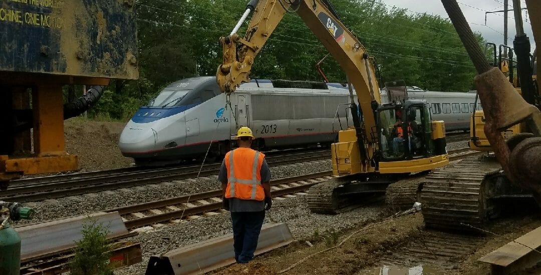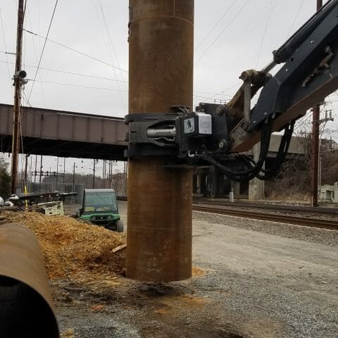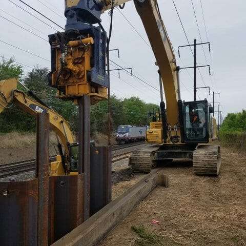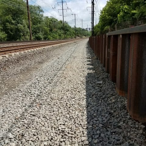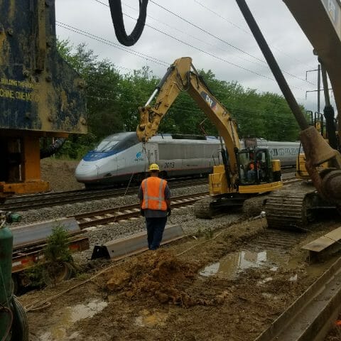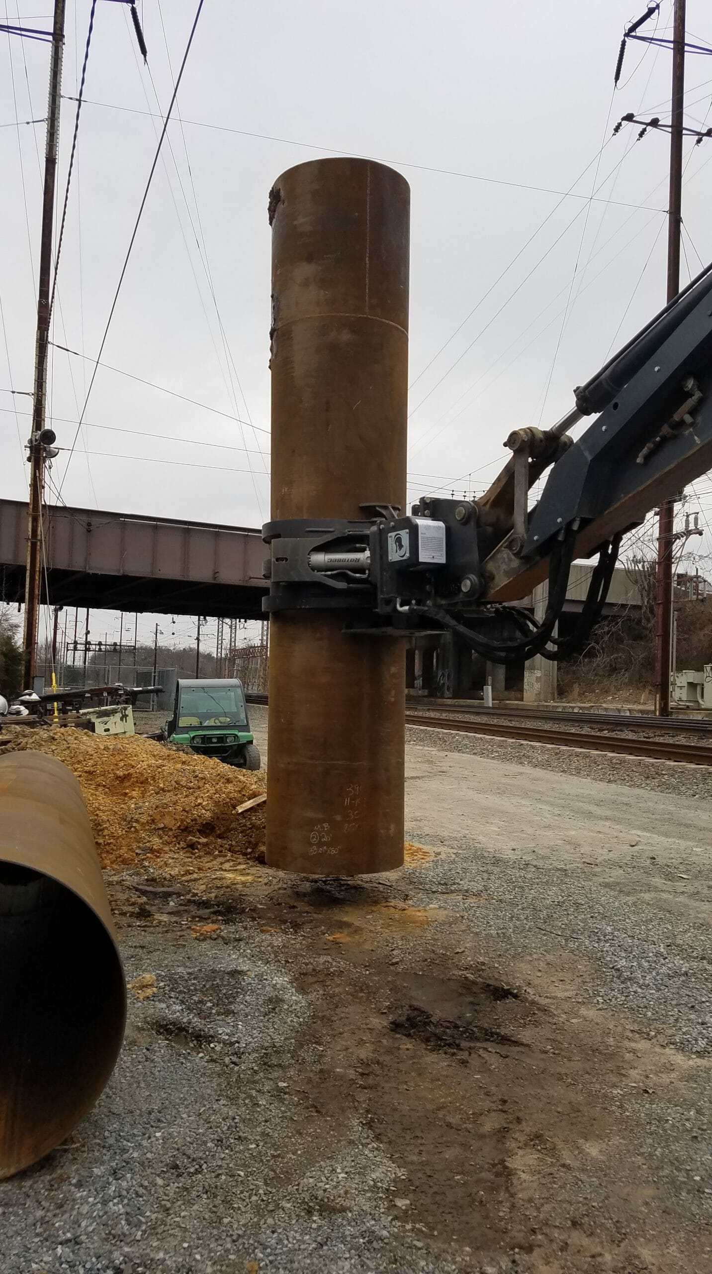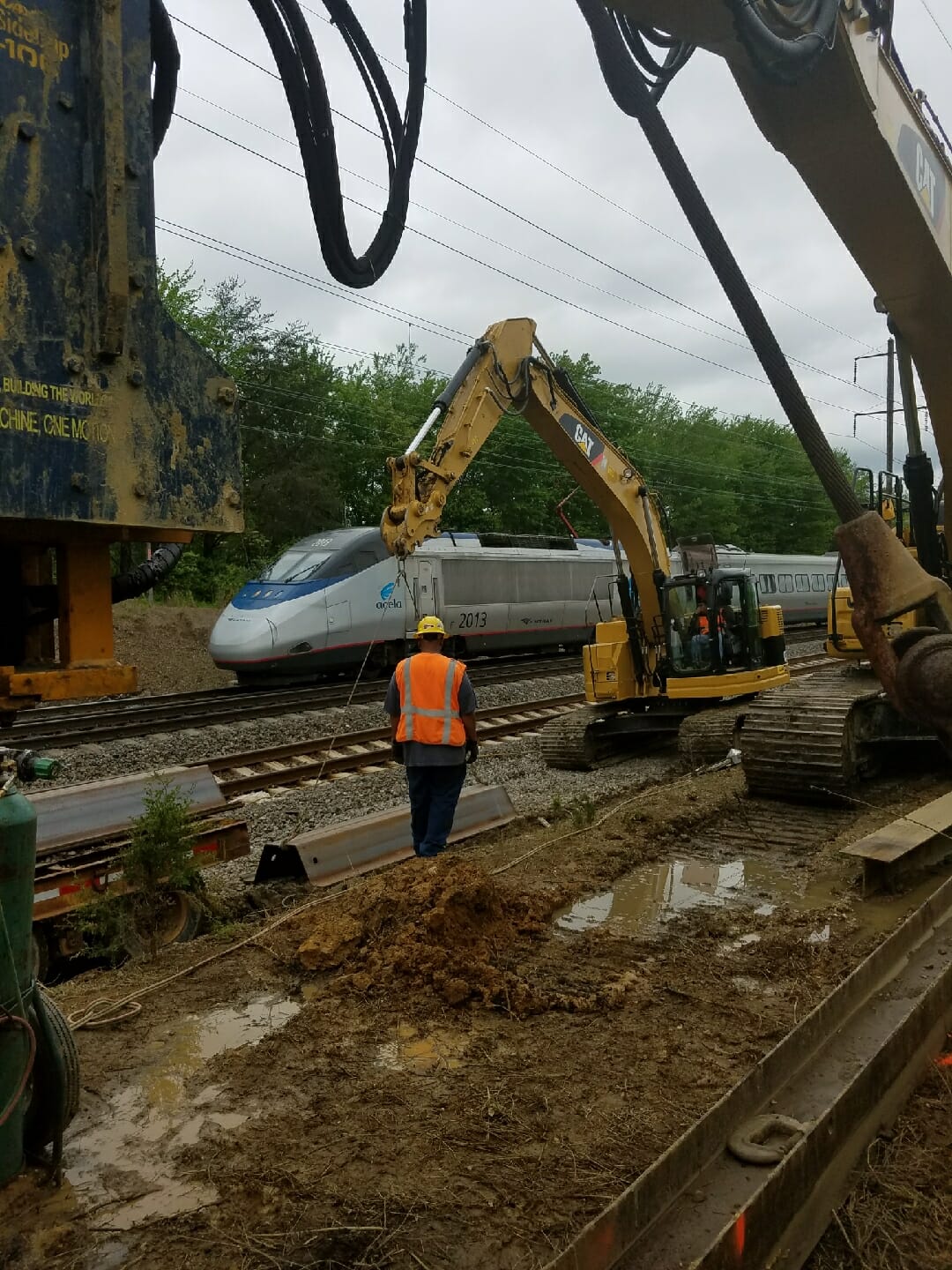 This project consisted of several different contracts to instal a new high-speed interlock along Amtrak’s northeast corridor allowing their commuter trains to switch between Tracks, 3, 2, and 1 at high speed, CSX freight trains to move from Track 1 to Track 2 and makes provisions for the interlock expansion to accommodate an eventual fourth track expansion. The first contract included installation of 82 new drilled foundations for the new overhead catenary system, which are 48-in. and 42-in. in diameter and 34-ft. deep. They were drilled with a low head room unconventional drill to install without requiring overhead transmission electrical outages. Installed steel rebar cages around power lines and constructed three precast retaining walls to construct the new Hanson Interlocking: 41 foundations on the east side of the tracks and 41 on the west side of the tracks. Constructed a temporary access road to access foundations on the west side of the railroad and installed 28 down guy foundation attachment points for future down guy connections. Construction was in confined limits, including drilling the shaft, installing the casing liner, setting the steel rebar cages, layout for catenary pole bolts, and placing the concrete for the catenary pole foundations. Kokosing used a large excavator capable of reaching the overhead power lines and a TCC 650 crane to install steel caissons in confined limits for the new foundations and worked in/around Pepco and Amtrak transmission lines during set power outages. To pour concrete for the new foundations on the west side of the railroad, we used a conveyance method (temporary pump hose and pipe) under the tracks as there was no access for a concrete truck. The second contract consisted of constructing a one-mile (4,700-ft.) long access road along Track 1 between the WMATA property line and adjacent to the track, with the majority constructed of permeable materials. Amtrak obtained the permits from Maryland Dept. of the Environment (MDE) and held a separate contract to maintain the site for environmental compliance. Kokosing obtained a WMATA Real Estate Permit to move a WMATA security fence at Amtrak’s request and coordinated work with WMATA watchmen and inspection staff. Kokosing surveyed for layout one-mile sheet pile wall, stormwater management facility, and for Amtrak’s catenary poles. To support the new access road, Kokosing installed over 3,000,000 lbs. of PZ sheets, 13-ft. to 52-ft. long, 15,000 TN of new aggregate, and a mile of new drainage pipe. The new road was designed/installed to function as a sand filter for run off. Work included rough grading via earth moving equipment to provide a platform for the sheet pile driving. Installed 5,200 LF sheet piles along the catenary pole line to retain the fill material for the road. Top of finished road is 12-in. below the top of Track 2’s east rail. Kokosing used a Link Belt TCC 750 crane to install the steel sheeting in confined limits and worked in/around Pepco and Amtrak transmission lines during set power outages. Installed 5,000 LF of 12-in. HDPE N-12 underdrain pipe 3-ft. below grade which ran parallel to the railroad 15-ft. to 30-ft. away. The third contract consisted of installing ¾ of a mile of new electrical duct bank which will supply power to the new interlocking system. The edge of the duct bank is just over 12-ft. away from Track 1. The new 2 x 4-in. reinforced concrete encased duct bank is 5-ft. deep. Due to the proximity of the track and Amtrak’s support of excavation specification, crews installed sheet piling along both sides of the duct bank for excavation. A sliding template and the Movax were used to expedite construction and to keep the required clearances with the overhead catenary and steady span electric lines. PROJECT DETAILS Project Owner: Amtrak Project Value: $20,610,551.88 Delivery Method: Design-Bid-Build 2021.10.18 E619W 2017.06.23 DL (4) Install sheetpile retaining wall 2017.11.18 SM (1) 2017.04.19 SM (1) 20190227_123339 20190227_085148 Lowheadroom equip to install casingpipe Close 2021.10.18 E619W 2017.06.23 DL (4) Install sheetpile retaining wall 2017.11.18 SM (1) 2017.04.19 SM (1) 20190227_123339 20190227_085148 Lowheadroom equip to install casingpipe