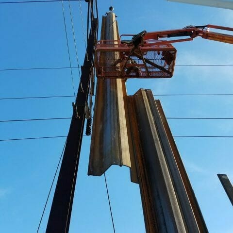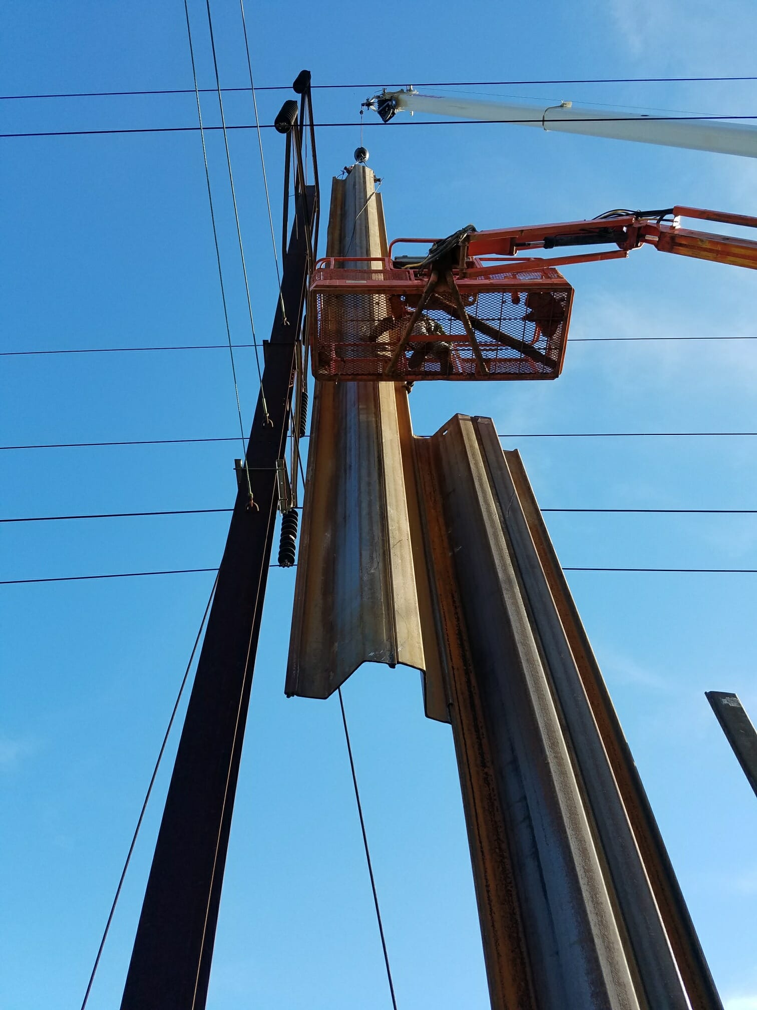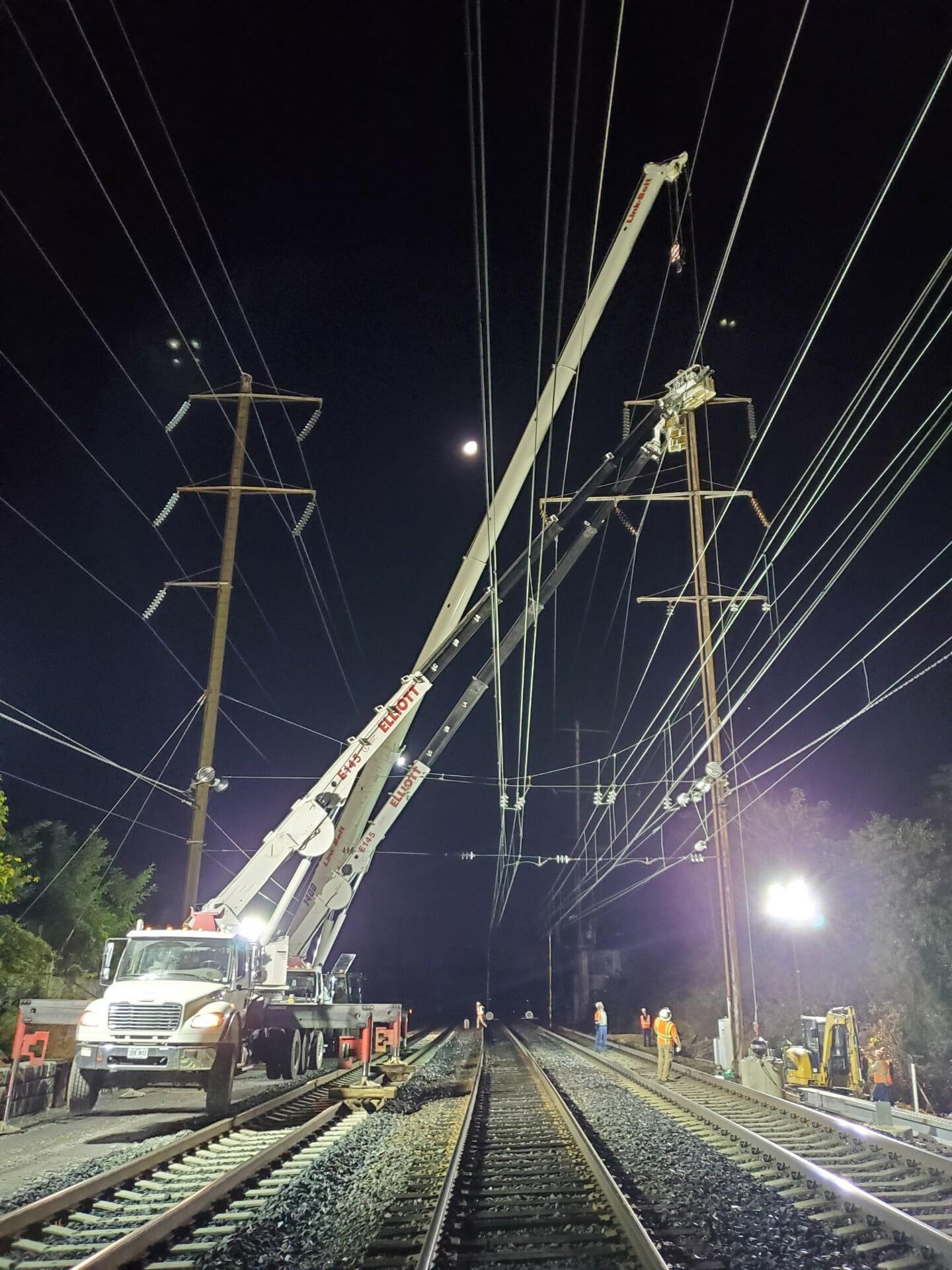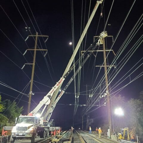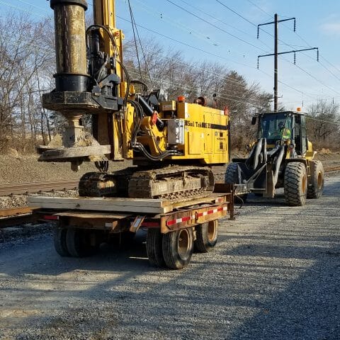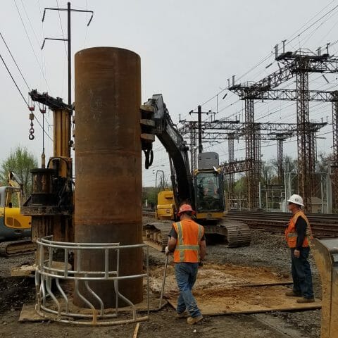 Transportation Electrification Modifications for Hanson Interlocking > Projects > Electrification Modifications for Hanson Interlocking This project consisted of several different contracts to instal a new high-speed interlock along Amtrak’s northeast corridor allowing their commuter trains to switch between Tracks, 3, 2, and 1 at high speed, CSX freight trains to move from Track 1 to Track 2 and makes provisions for the interlock expansion to accommodate an eventual fourth track expansion. The first contract included installation of 82 new drilled foundations for the new overhead catenary system, which are 48-in. and 42-in. in diameter and 34-ft. deep. They were drilled with a low head room unconventional drill to install without requiring overhead transmission electrical outages. Installed steel rebar cages around power lines and constructed three precast retaining walls to construct the new Hanson Interlocking: 41 foundations on the east side of the tracks and 41 on the west side of the tracks. Constructed a temporary access road to access foundations on the west side of the railroad and installed 28 down guy foundation attachment points for future down guy connections. Construction was in confined limits, including drilling the shaft, installing the casing liner, setting the steel rebar cages, layout for catenary pole bolts, and placing the concrete for the catenary pole foundations. Kokosing used a large excavator capable of reaching the overhead power lines and a TCC 650 crane to install steel caissons in confined limits for the new foundations and worked in/around Pepco and Amtrak transmission lines during set power outages. To pour concrete for the new foundations on the west side of the railroad, we used a conveyance method (temporary pump hose and pipe) under the tracks as there was no access for a concrete truck. The second contract consisted of constructing a one-mile (4,700-ft.) long access road along Track 1 between the WMATA property line and adjacent to the track, with the majority constructed of permeable materials. Amtrak obtained the permits from Maryland Dept. of the Environment (MDE) and held a separate contract to maintain the site for environmental compliance. Kokosing obtained a WMATA Real Estate Permit to move a WMATA security fence at Amtrak’s request and coordinated work with WMATA watchmen and inspection staff. Kokosing surveyed for layout one-mile sheet pile wall, stormwater management facility, and for Amtrak’s catenary poles. To support the new access road, Kokosing installed over 3,000,000 lbs. of PZ sheets, 13-ft. to 52-ft. long, 15,000 TN of new aggregate, and a mile of new drainage pipe. The new road was designed/installed to function as a sand filter for run off. Work included rough grading via earth moving equipment to provide a platform for the sheet pile driving. Installed 5,200 LF sheet piles along the catenary pole line to retain the fill material for the road. Top of finished road is 12-in. below the top of Track 2’s east rail. Kokosing used a Link Belt TCC 750 crane to install the steel sheeting in confined limits and worked in/around Pepco and Amtrak transmission lines during set power outages. Installed 5,000 LF of 12-in. HDPE N-12 underdrain pipe 3-ft. below grade which ran parallel to the railroad 15-ft. to 30-ft. away. The third contract consisted of installing ¾ of a mile of new electrical duct bank which will supply power to the new interlocking system. The edge of the duct bank is just over 12-ft. away from Track 1. The new 2 x 4-in. reinforced concrete encased duct bank is 5-ft. deep. Due to the proximity of the track and Amtrak’s support of excavation specification, crews installed sheet piling along both sides of the duct bank for excavation. A sliding template and the Movax were used to expedite construction and to keep the required clearances with the overhead catenary and steady span electric lines. PROJECT DETAILS Project Owner: Amtrak Project Value: $20,610,551.88 Delivery Method: Design-Bid-Build 2021.10.18 E619W 2017.06.23 DL (4) Install sheetpile retaining wall 2017.11.18 SM (1) 2017.04.19 SM (1) 20190227_123339 20190227_085148 Lowheadroom equip to install casingpipe Close 2021.10.18 E619W 2017.06.23 DL (4) Install sheetpile retaining wall 2017.11.18 SM (1) 2017.04.19 SM (1) 20190227_123339 20190227_085148 Lowheadroom equip to install casingpipe