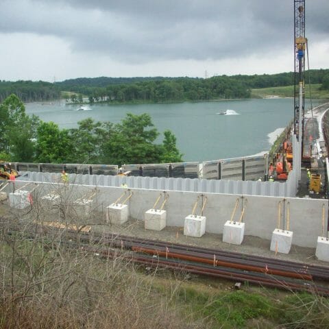 INSIDE THE PROJECT In Brilliant, Ohio, Kokosing constructed a very challenging dam raising project. Due to increased capacity needs of the Owner within the existing limits, the dam needed to be raised an additional 13 feet. The solution to building this on a small footprint was to install back-to-back mechanically stabilized earth (MSE) walls constructed on top of the existing dam. Seepage was controlled by installing vinyl sheet piling through the roller compacted concrete zone of the existing dam and into the clay core. The existing emergency spillway was raised using mass concrete and traditional cast-in-place concrete training walls to direct flow into the channel. The project also required improvements to an existing single-lane access road providing access to the work area from a local county road. Kokosing met the challenge and completed according to schedule. PROJECT DETAILS: Project Owner: Private Owner Location: Brilliant, Ohio Project Value: $6,800,000 Delivery Method: Design-Bid-Build CAPABILITIES: Noisewall / Retaining Wall Piling Close