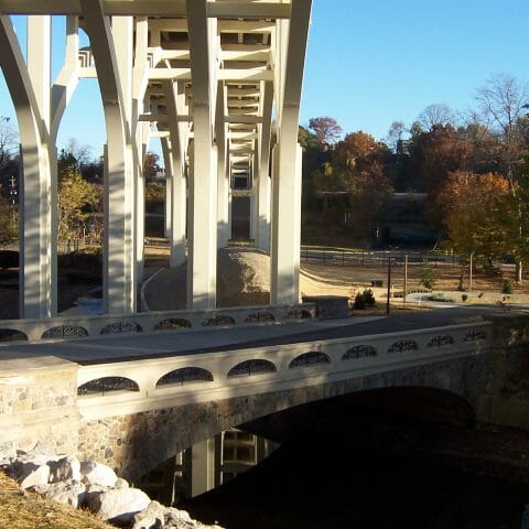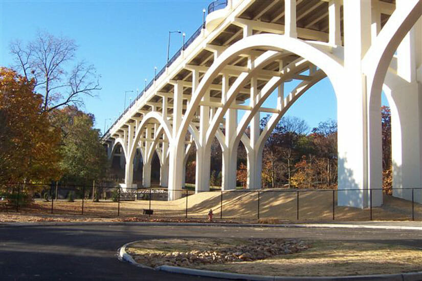INSIDE THE PROJECT This $45 million project required the replacement of the six-span, open-spandrel, arch bridge which overlooks the Cleveland Metroparks Zoo and spans a historic bridge, two railroad tracks, and several maintenance roads and footpaths. The presence of rail tracks, roads, paths, and in particular, the maintenance of the historic bridge, made site navigation, set-up, and construction a real challenge. In an effort to, “Do what it takes to do the job,” Kokosing purchased a 300-ton Liebherr crane specifically to handle the challenges. The new structure is an 11-span, pre-cast, open-spandrel, arch bridge. Nearly 1,800-cubic-yards of self-leveling mass concrete is contained in the bridge piers. These seven piers were post-tensioned to support the pre-cast arches, which were erected in segments on shoring towers and then post-tensioned. Following the erection of the arches, the spandrel columns and caps were poured. Pre-cast concrete beams were also erected to support the bridge deck. Additionally, all approach work, including storm sewer, water line, mechanically stabilized earth (MSE) wall, pre-cast lagging retaining wall, and concrete pavement construction was self-performed by Kokosing. PROJECT DETAILS: Project Owner: Ohio Department of Transportation Location: Cleveland, Ohio Project Value: $45,859,138 Delivery Method: Design-Bid-Build CAPABILITIES: Beam/Girder Erection Bridges Post-Tensioning PROJECT AWARDS INCLUDE: Precast/Prestressed Concrete Institute (PCI) – Best Bridges with Main Spans greater than 150 feet, 2010 Northeast Ohio Association for Bridge Construction and Design (ABCD) – Outstanding Major Bridge Award, 2011 American Council of Engineering Companies (ACED) – Engineering Excellence Awards – Outstanding Achievement, 2011 Close