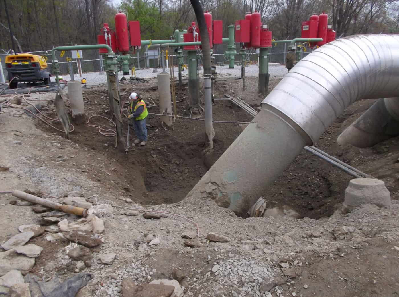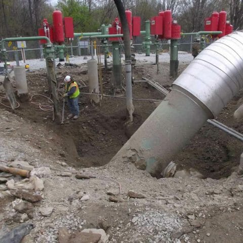 Oil & Natural Gas Hydrostatic Testing of Existing Compressor Station > Projects > Hydrostatic Testing of Existing Compressor Station Not limited to working only in the Midwest region, IKPS is not afraid to travel to meet our client’s project requirements and timelines. This Integrity Management project is an example of a complex compressor station located in New York. Consisting of pipe 2 inches to 36 inches in size and up to .750 wall thickness (Grade X-70), IKPS was hired to perform upgrades and hydrostatic testing of the existing below- and above-ground pipe system. Because of the below-ground configuration and congestion of the active pipelines, mechanical excavation was not feasible. Instead all excavation was done by air knife and hydro-excavation. IKPS worked with the client to develop a step-by-step procedure to perform the hydrostatic testing in multiple segments, in order to manage to intricate pipe system. This test involved taking the pipeline out of service (blow-down, air mover operations, cold cut and removal of pipe sections) filling with water, holding the pressure for 8 hours, then drying the system to a -40 degree dew point. Once the line was tested, IKPS proceeded with the upgrade and replacement work, then supported the client through the commissioning process. PROJECT DETAILS: Location: New York Close