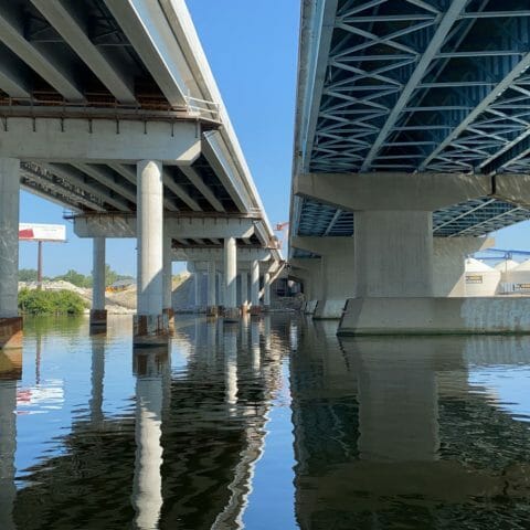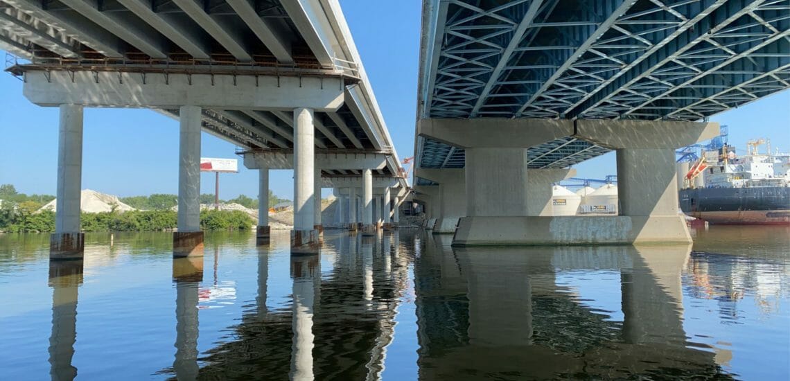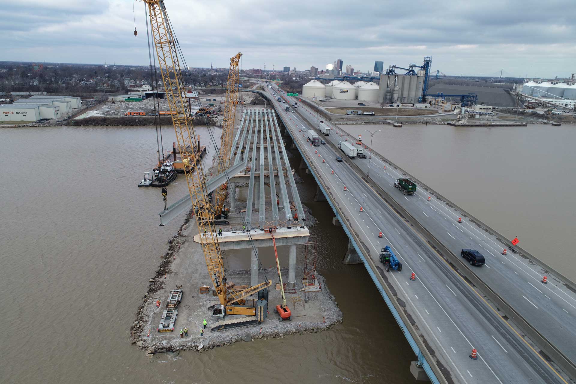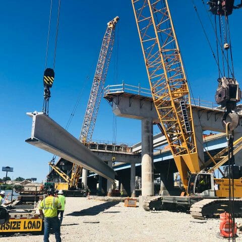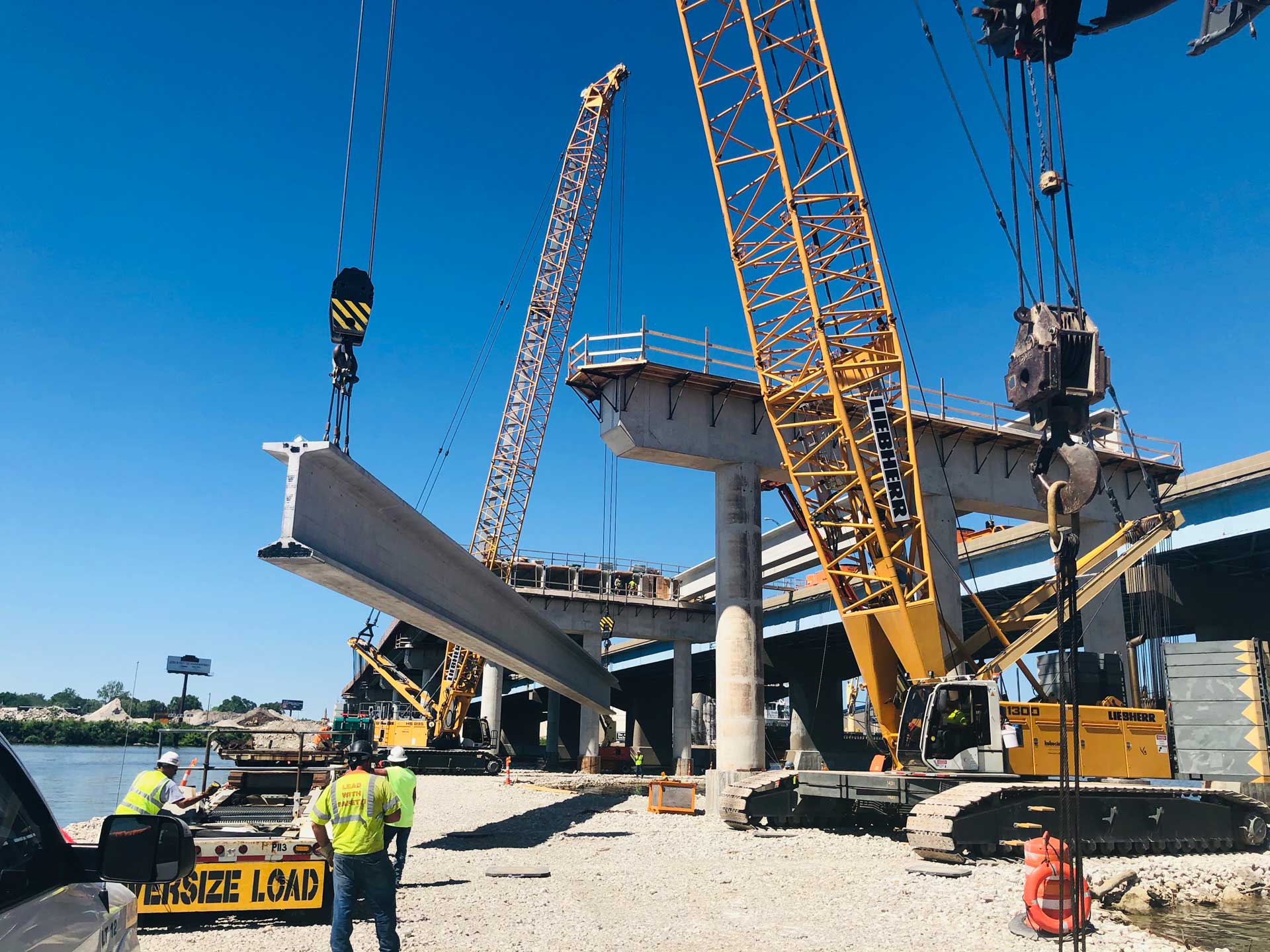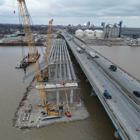 The most notable component of this project is the reconstruction of the Maumee River bridge – which is nearly ½ mile in length and approximately 60-feet-tall measured from the river to the deck surface. Prior to any structural work taking place, Kokosing first had to build a causeway across the river (in water up to 24-feet-deep) and consisted of over 100,000-cubic-yards of material. After the first phase of the causeway was complete, Kokosing began construction on the new southbound bridge, continuing through most of 2020. Each of the new bridges consist of 11 piers sitting on drilled shaft foundations with shafts up to 84-inches in diameter – while the superstructure is comprised of 214 EA 7-foot-tall prestressed concrete beams with an average length of 166-feet. Once the new southbound structure is complete, traffic will switch onto the new bridge and subsequently begin demolition of the existing structure. Finally, the new northbound bridge will be constructed and traffic will be relocated to its final condition in 2023. In total, 19,600-cubic-yards of concrete, 5.6-million-pounds of reinforcing steel, and 5,000-linear-feet of drilled shafts were required for this bridge alone.