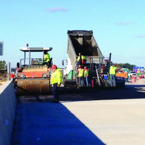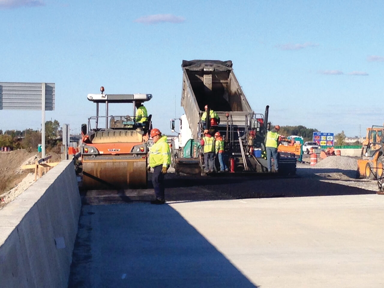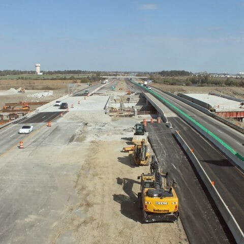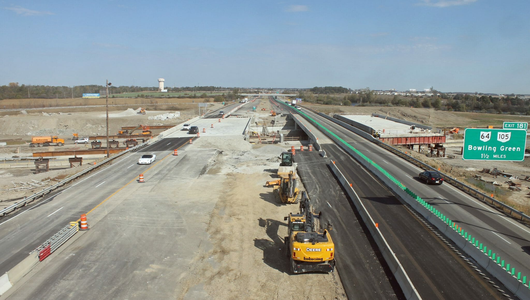 This $71 million project near Bowling Green, Ohio, involved approximately nine miles of third-lane widening and full-depth replacement of all existing mainline pavement on I-75. While maintaining 75,000 vehicles per day through the work zone, the project constructed 250,000 cubic yards of excavation, 11,500 linear feet of storm drainage, 515,000 tons of asphalt, and eight bridges consisting of four slab bridges, two steel beam bridges, and two concrete beam bridges.