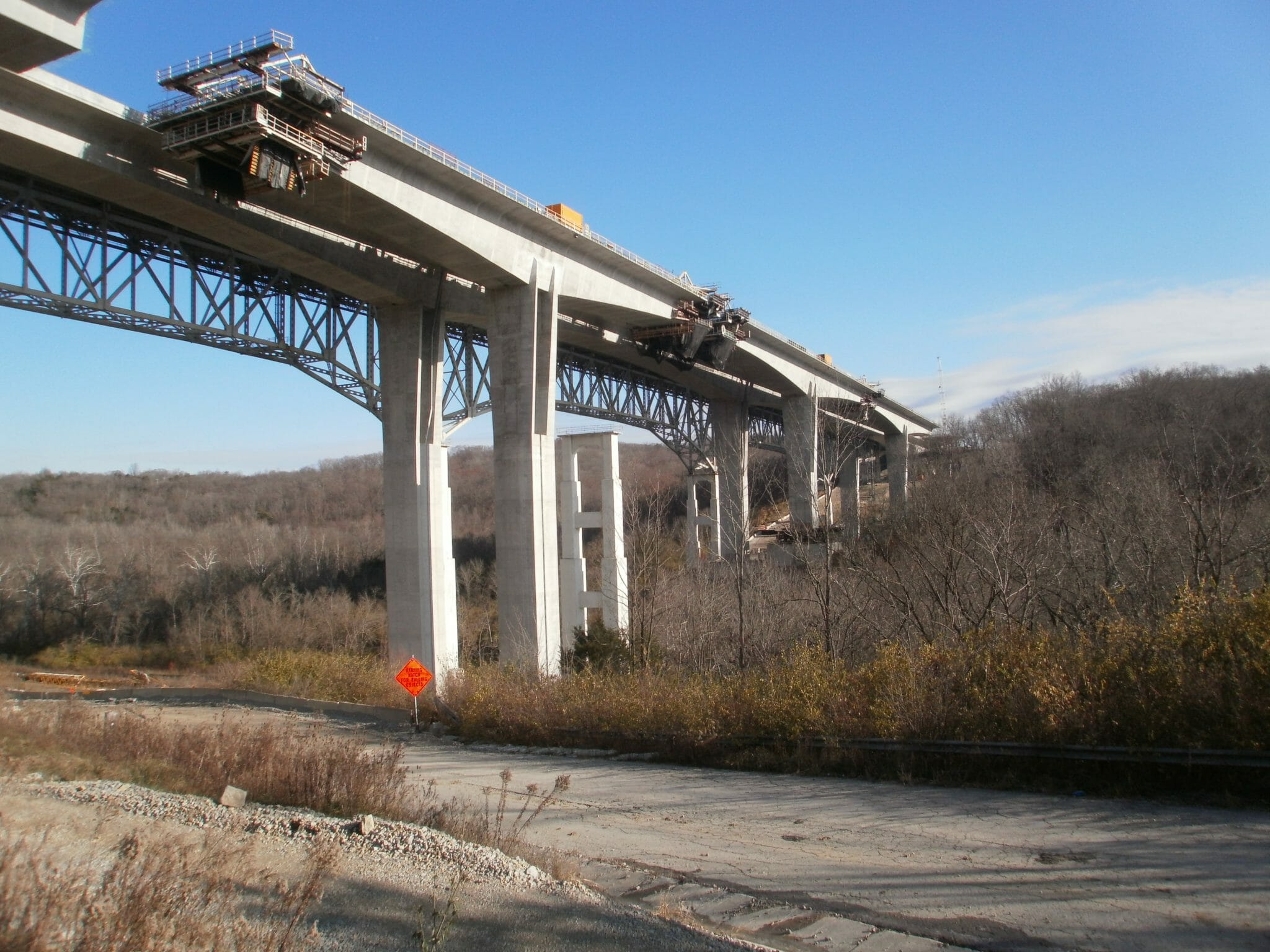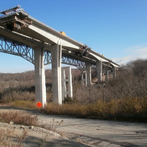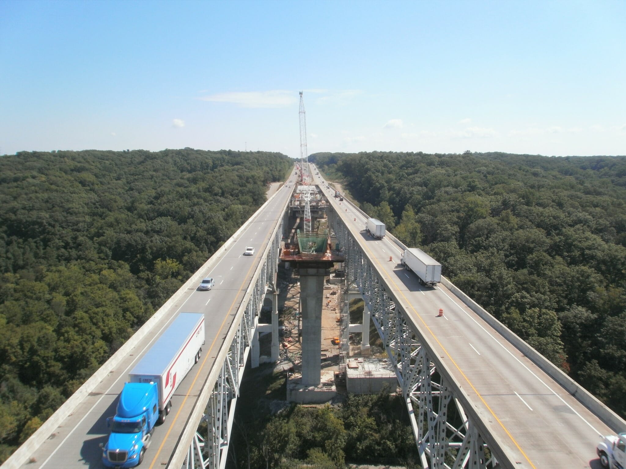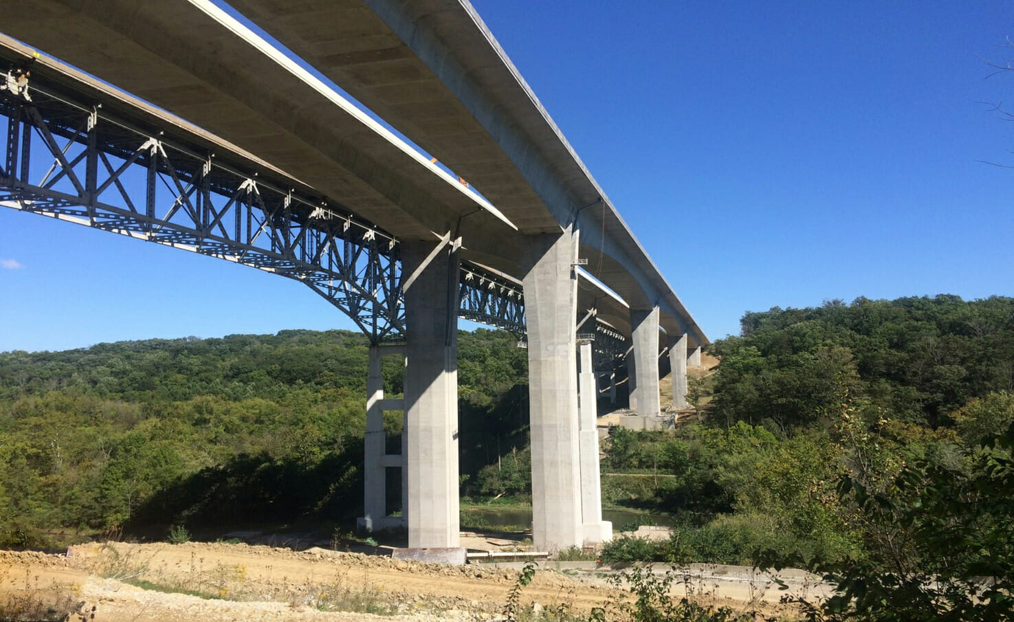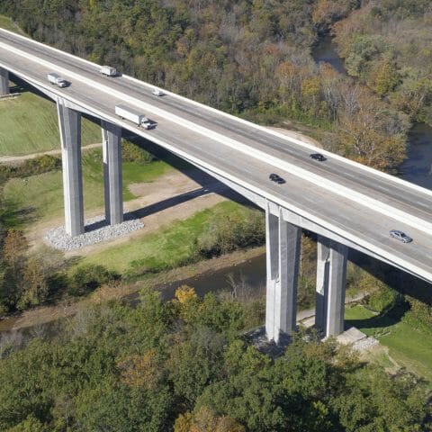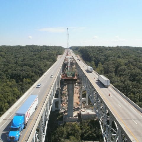 The Jeremiah Morrow Bridge sits 239-feet above the Little Miami River and spans 2,252-feet in length. Kokosing was awarded an $88.1 million contract to replace the existing steel deck truss structures with cast-in-place, balanced cantilevered concrete segmental box girder bridges. The six-span superstructures sit on hollow-box monolithic piers and consist of single-cell boxes varying in height from 10-feet to 19-feet. Kokosing’s custom-built forms advanced the piers while a custom-modified form-traveler system serviced the superstructure.