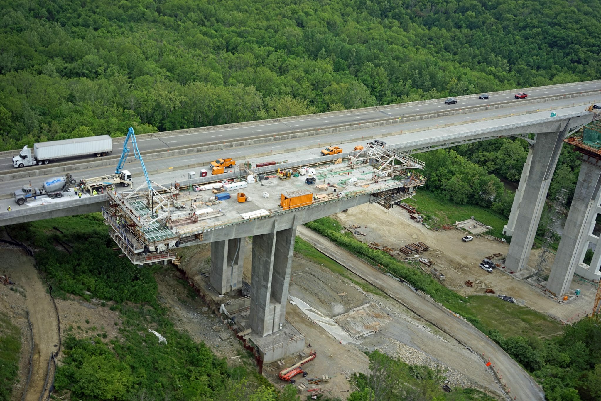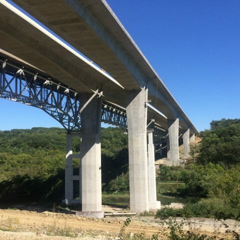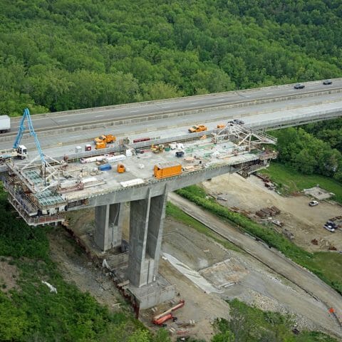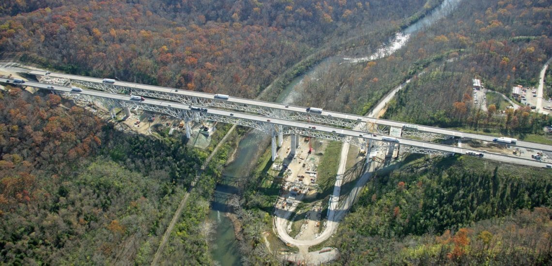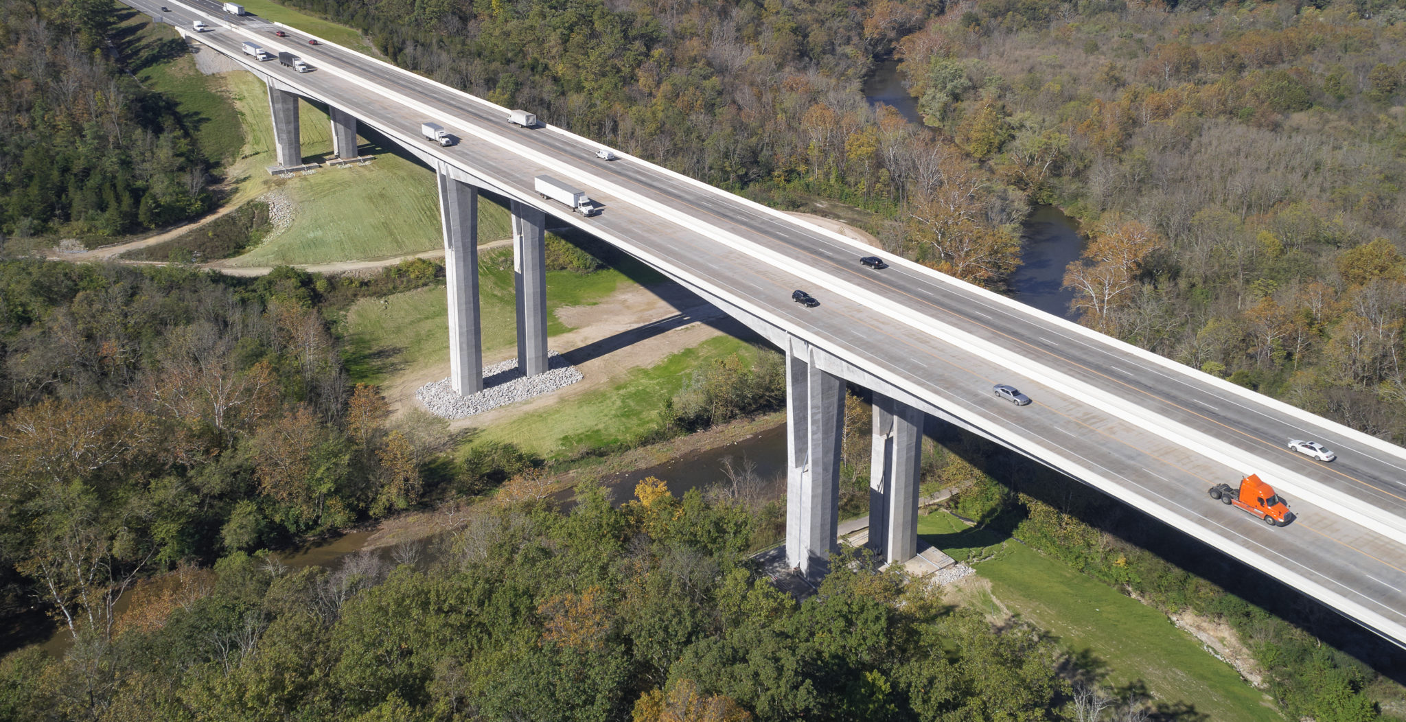 The Jeremiah Morrow Bridge sits 239-feet above the Little Miami River and spans 2,252-feet in length. Kokosing was awarded an $88.1 million contract to replace the existing steel deck truss structures with cast-in-place, balanced cantilevered concrete segmental box girder bridges. The six-span superstructures sit on hollow-box monolithic piers and consist of single-cell boxes varying in height from 10-feet to 19-feet. Kokosing’s custom-built forms advanced the piers while a custom-modified form-traveler system serviced the superstructure.