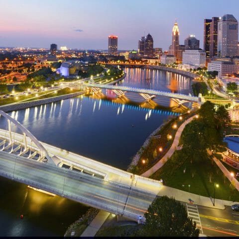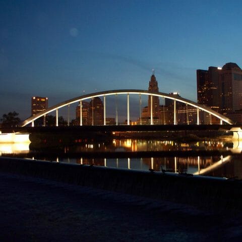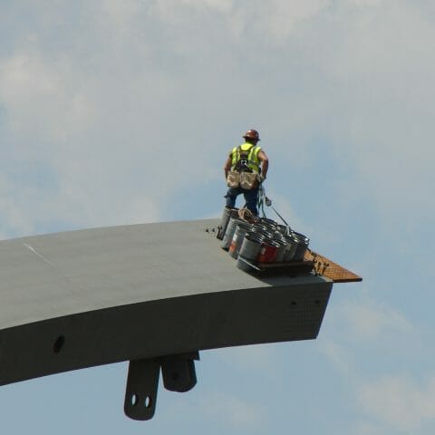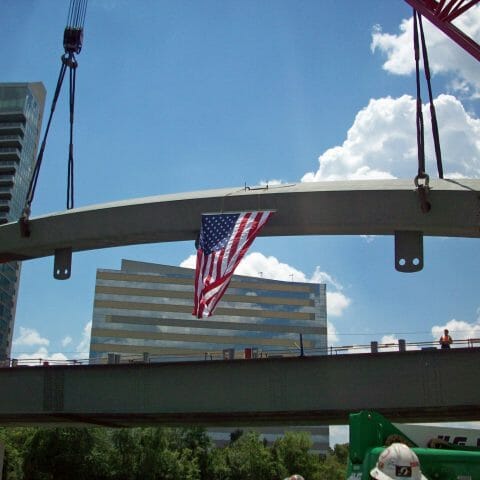 Located in Columbus, Ohio, this inclined, single-rib arch bridge is the first of its kind to be built in the U.S. The $44 million, ODOT bridge replacement project is a three-span structure measuring 675-feet in length – with a main span of 400-feet. The bridge’s foundation consists of 30 each, 70-foot-long 6 foot diameter shafts reinforced with double-cage rebar. The cast-in-place concrete substructure includes internal cooling pipes to maintain rigorous temperature tolerances. Each pier has more than 325,000-pounds of reinforced steel and features single, 900-cubic-yard concrete pours. The superstructure of the 5.75-million-pound bridge consists of trapezoidal steel vehicular boxes with floor beams projecting from both sides that support the cast-in-place concrete deck.