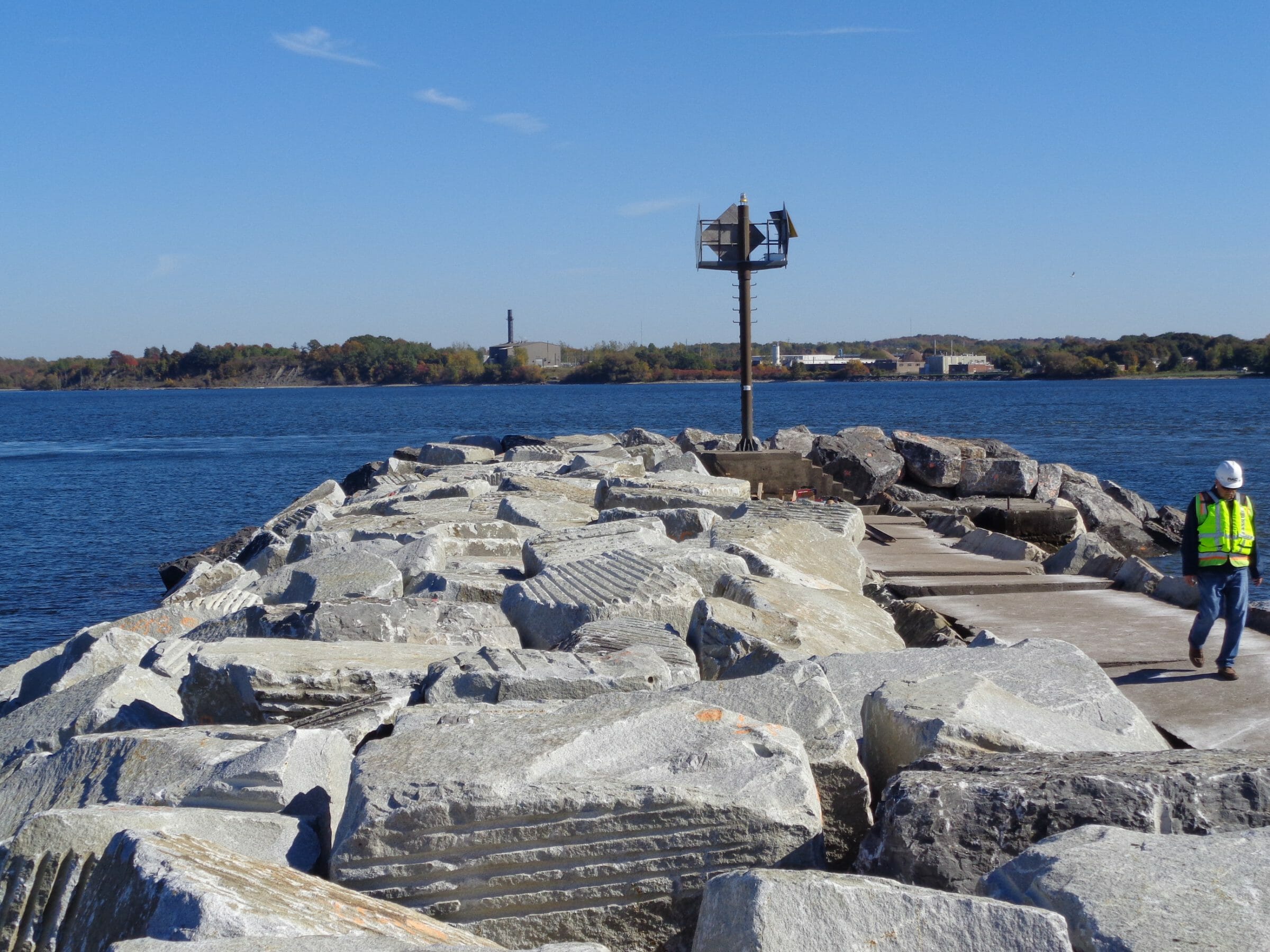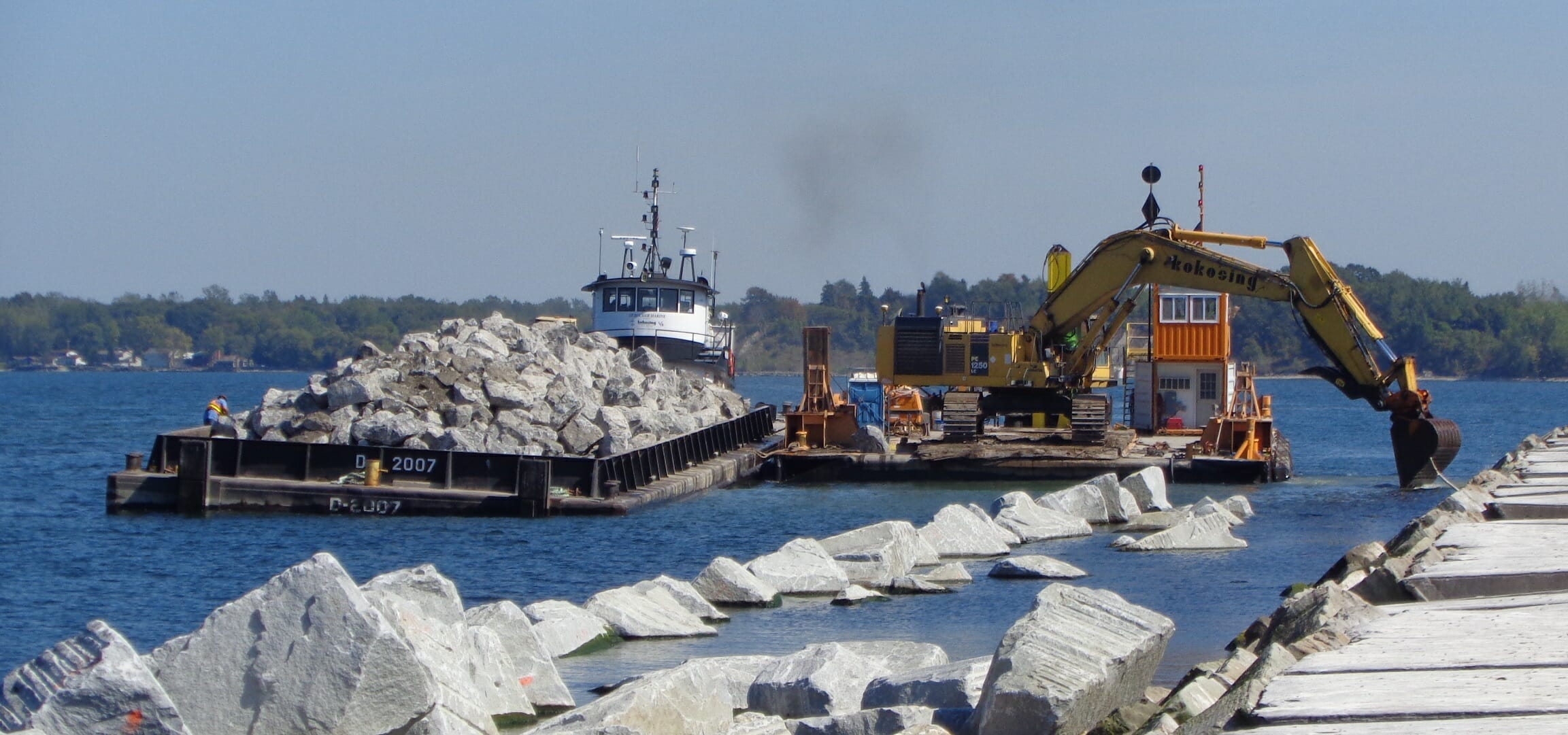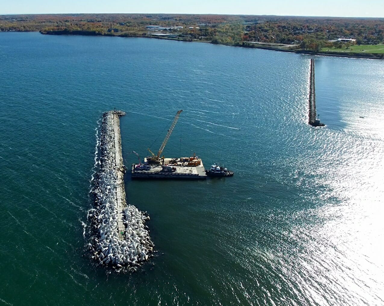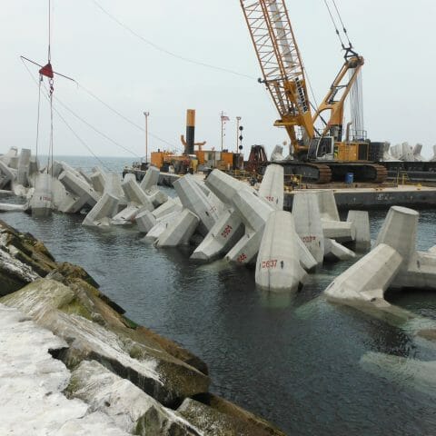 Marine Oswego Breakwall Repairs > Projects > Oswego Breakwall Repairs REBUILDING AFTER HURRICANE SANDY The USCOE Buffalo district contracted Kokosing to rebuild the Oswego Outer Breakwall after Hurricane Sandy severely damaged the structure. INSIDE THE PROJECT The outer breakwall in Oswego NY was built in the 1880’s. The breakwall had slowly deetiolated and was worsened by Superstorm Sandy in 2012. The project included adding approximately 115,000 tons of breakwall stone, and 1,000 concrete Dolosse. It also included a new navigation light and a boat landing. The breakwall stone came from multiple sources in New York and Vermont. The local stone was trucked to the site and the rest was shipped by rail. All materials were received at the Port of Oswego, loaded onto barges, and placed by our marine crews. The bulk of the stone was 8 – 18 ton Armor stone. Due to quality issues, multiple sources were required to produce 70,000 tons of Armor. The project also included placing concrete Dolosse on the western end of the breakwall. The Dolosse were constructed in a pre-cast yard approximately 100 miles from the jobsite. Due to weight limitations, only 1 Dolosse per truck could be shipped. Special forms were constructed to make the pieces. Each unit was reinforced with steel. Placement of the Dolosse required a special survey tracking system. Each unit was placed in a predetermined location designed to populate any given area with a minimum density. The tracking system included an x,y,z position and a rotational component. As each Dolosse was placed, the system tracked it’s precise as-laid position, and logged it to a data base. The software built a virtual image of all placed Dolosse, and assured the required random pattern was achieved. WHY IT MATTERS The Dolosse’s were an economical solution for the project. Since their use is limited in the US, the project was also created a case study for future use. BEYOND THE PROJECT The use of Dolosse is predominately found in areas where quality breakwall stone isn’t readily available. This system is used throughout the world. PROJECT DETAILS: Project Name: Oswego Breakwall Repairs DSC00463 DSC00650 DSCF6261 Exc stone L1050619 L1050652 Oswego 1 Close DSC00463 DSC00650 DSCF6261 Exc stone L1050619 L1050652 Oswego 1
