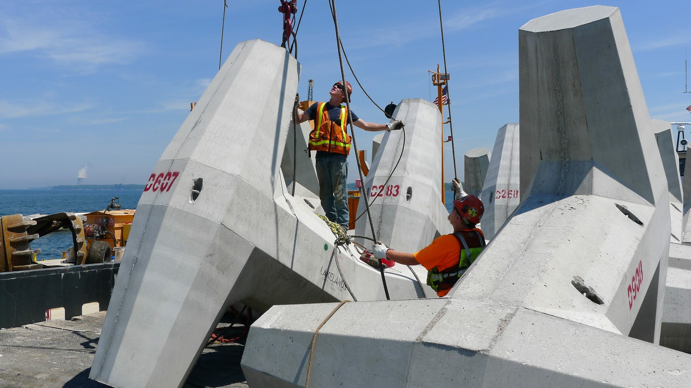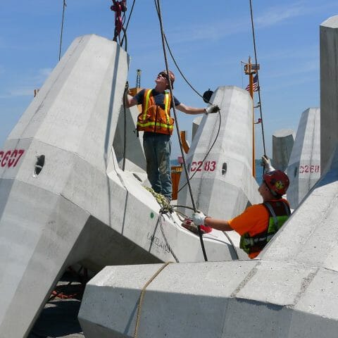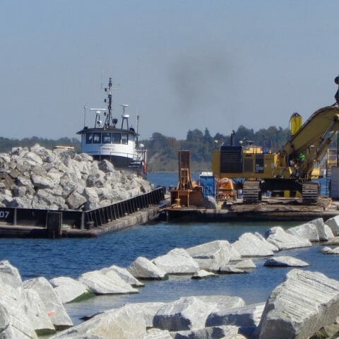REBUILDING AFTER HURRICANE SANDY The USCOE Buffalo district contracted Kokosing to rebuild the Oswego Outer Breakwall after Hurricane Sandy severely damaged the structure. INSIDE THE PROJECT The outer breakwall in Oswego NY was built in the 1880’s. The breakwall had slowly deetiolated and was worsened by Superstorm Sandy in 2012. The project included adding approximately 115,000 tons of breakwall stone, and 1,000 concrete Dolosse. It also included a new navigation light and a boat landing. The breakwall stone came from multiple sources in New York and Vermont. The local stone was trucked to the site and the rest was shipped by rail. All materials were received at the Port of Oswego, loaded onto barges, and placed by our marine crews. The bulk of the stone was 8 – 18 ton Armor stone. Due to quality issues, multiple sources were required to produce 70,000 tons of Armor. The project also included placing concrete Dolosse on the western end of the breakwall. The Dolosse were constructed in a pre-cast yard approximately 100 miles from the jobsite. Due to weight limitations, only 1 Dolosse per truck could be shipped. Special forms were constructed to make the pieces. Each unit was reinforced with steel. Placement of the Dolosse required a special survey tracking system. Each unit was placed in a predetermined location designed to populate any given area with a minimum density. The tracking system included an x,y,z position and a rotational component. As each Dolosse was placed, the system tracked it’s precise as-laid position, and logged it to a data base. The software built a virtual image of all placed Dolosse, and assured the required random pattern was achieved. WHY IT MATTERS The Dolosse’s were an economical solution for the project. Since their use is limited in the US, the project was also created a case study for future use. BEYOND THE PROJECT The use of Dolosse is predominately found in areas where quality breakwall stone isn’t readily available. This system is used throughout the world. PROJECT DETAILS: Project Name: Oswego Breakwall Repairs DSC00463 DSC00650 DSCF6261 Exc stone L1050619 L1050652 Oswego 1 Close DSC00463 DSC00650 DSCF6261 Exc stone L1050619 L1050652 Oswego 1