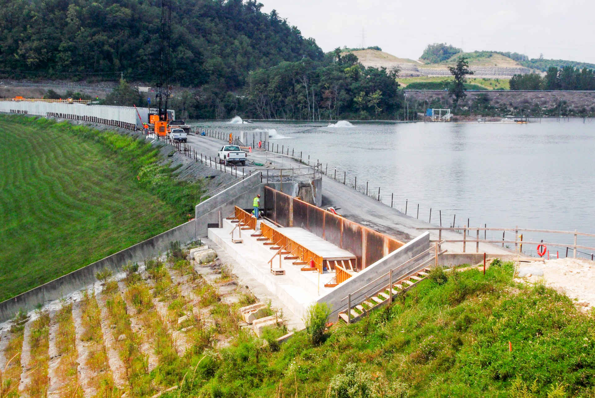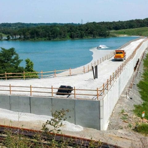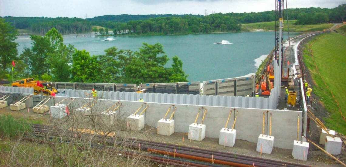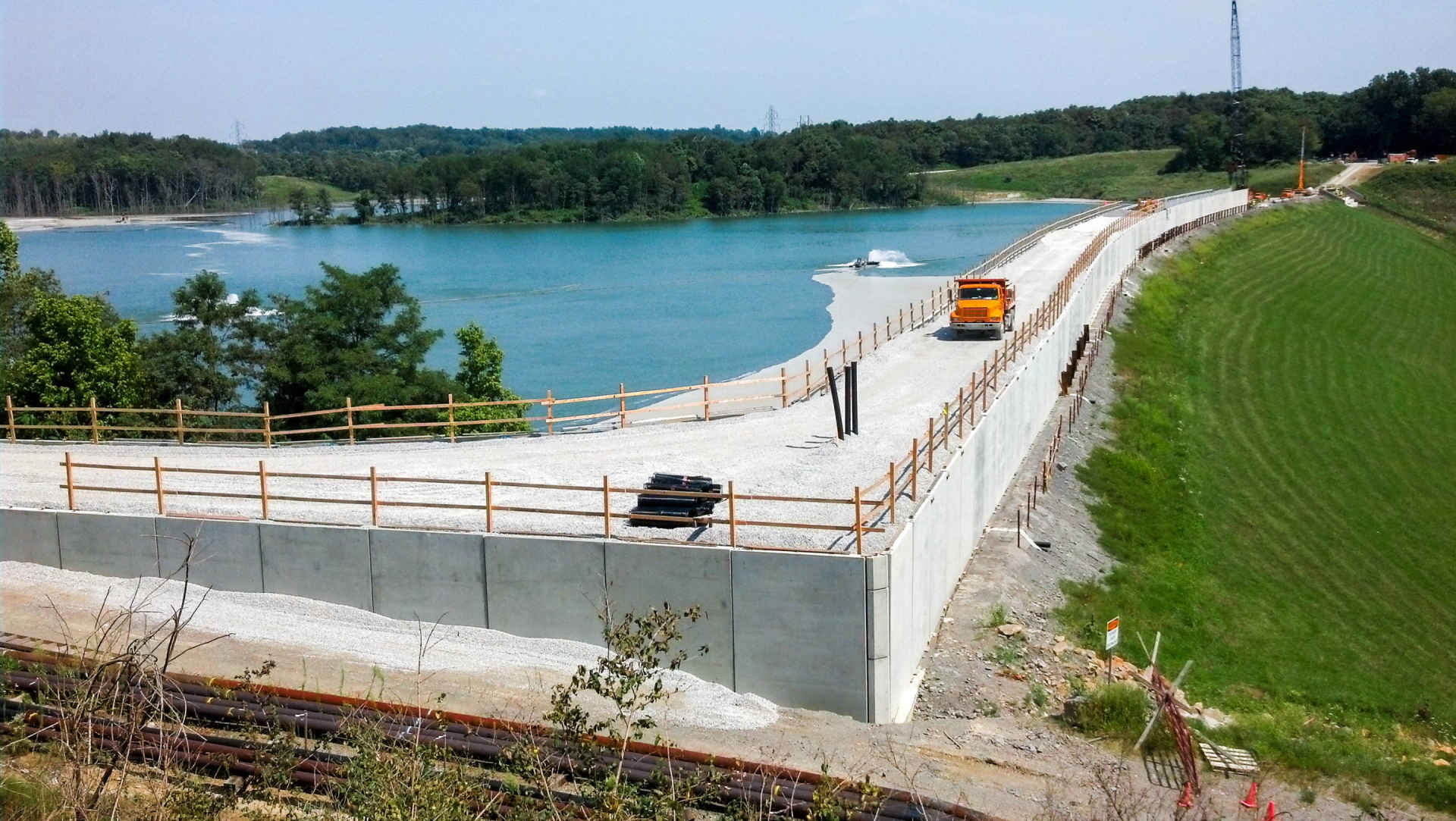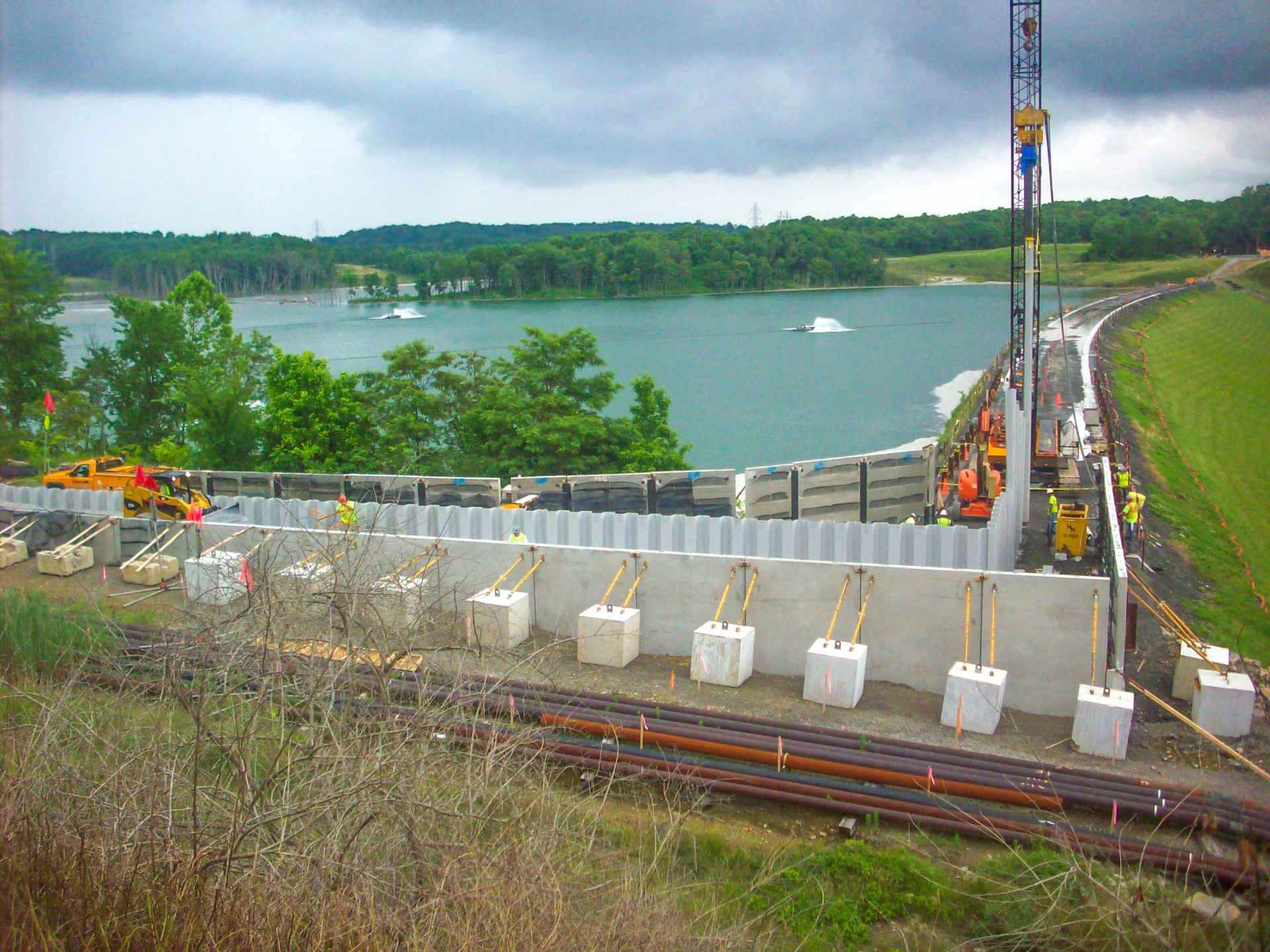 Heavy Civil RAISING THE BAR ON AN OHIO DAM > Projects > RAISING THE BAR ON AN OHIO DAM INSIDE THE PROJECT This project consisted of raising the existing Earthen Dam using precast concrete mechanically stabilized earth (MSE) wall panels and vinyl sheet piling (VSP) as a cutoff wall. The VSP was installed at a depth of 30 feet through a bentonite slurry wall that ran the entire length of the dam. The dam raising was approximately 1,600 feet long and 13 feet high. This project also included the construction of a mile long access road, existing spillway and spillway inlet raising. PROJECT DETAILS: Project Owner Private Power Generation Client Location Eastern Ohio acd3 acd5 acd4 acd1 acd2 Close acd3 acd5 acd4 acd1 acd2