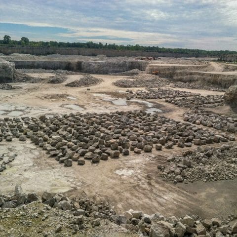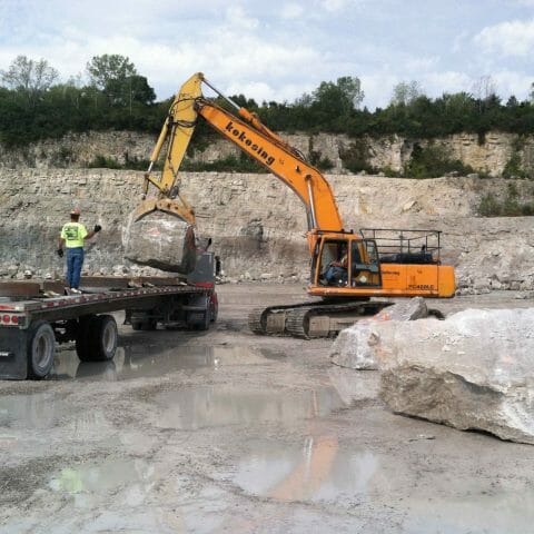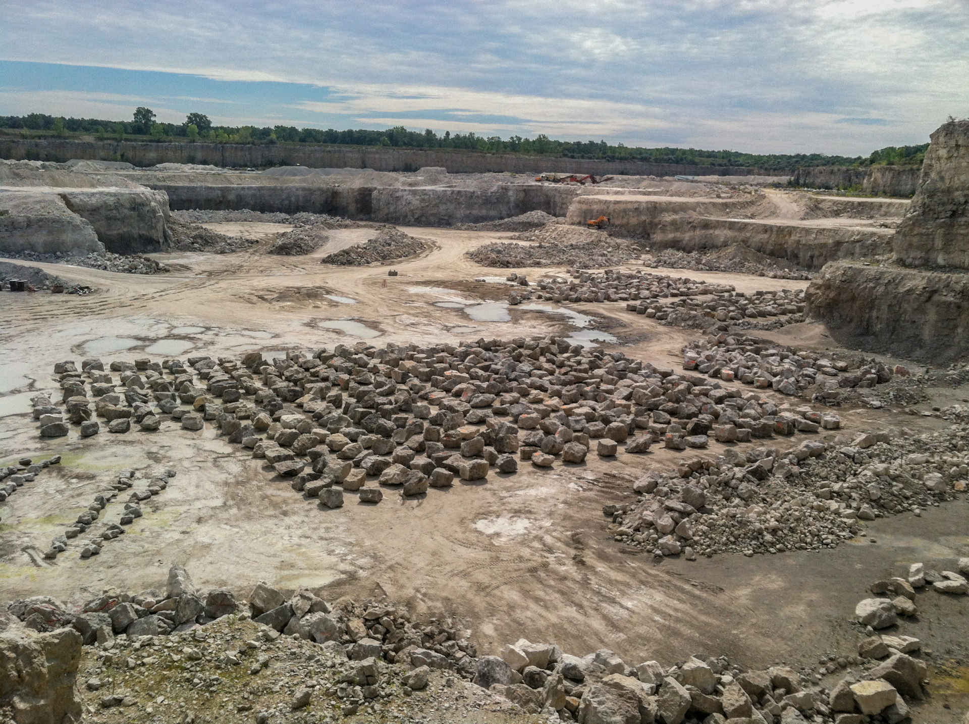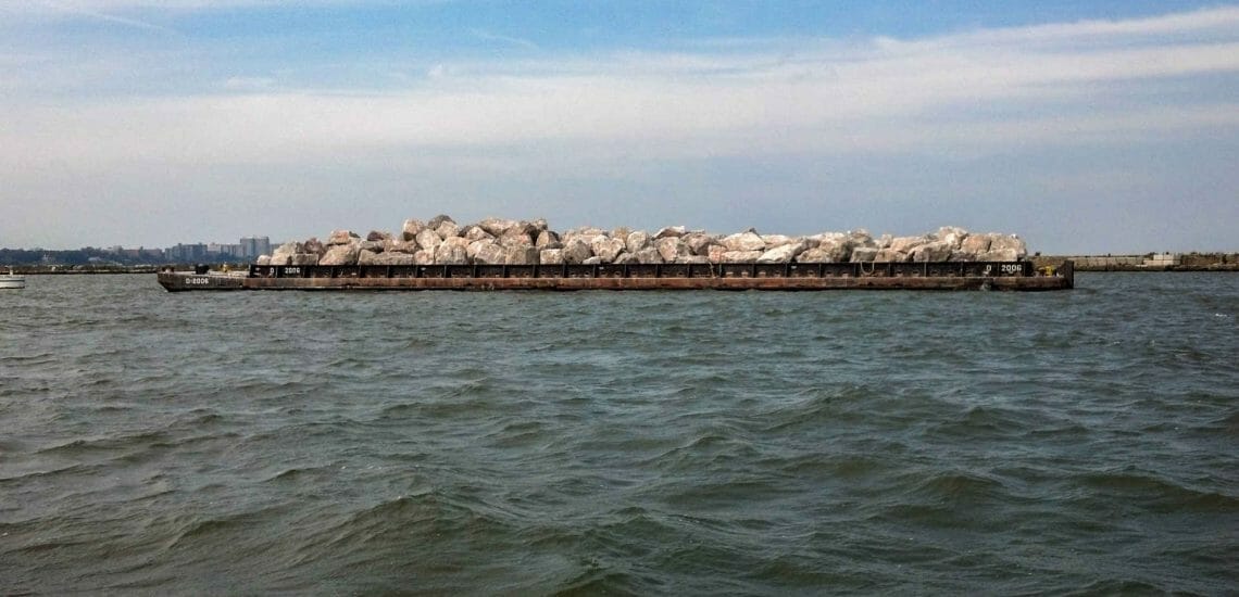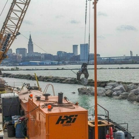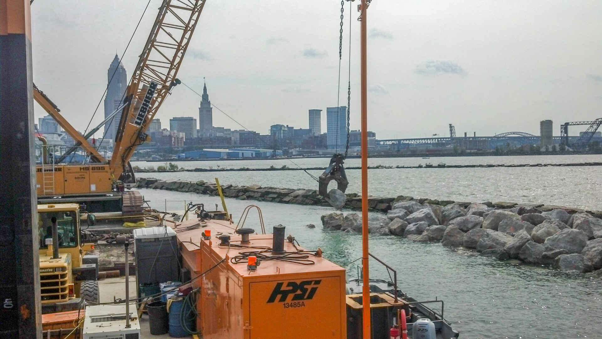 In October of 2012, Hurricane Sandy caused severe damage to the Outer Breakwall in Cleveland Ohio. The repair required multiple layers of breakwall stone to shore up the lakeward side. The outer layer included 5 – 11 Ton Armor Stone. All the stone materials were purchased from Area Aggregates, an Affiliate of Olen Corporation. The stone was produced at the Woodville Quarry. From there it was shipped to a dock, loaded on barges, and towed to the Cleveland Harbor on deck barges. Our crew placed all the stone with an 895 Liehberr Crane.