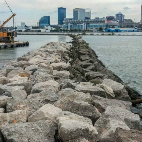 Rebuilding the Outer Breakwall in Cleveland Harbor will reduce wave action inside the harbor. Reducing wave action makes the Port of Cleveland safer for vessels entering the harbor and protects moored ships from storm damage. Overall it makes the Port of Cleveland a more attractive option for shipping business in the Great Lakes.