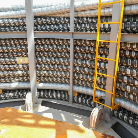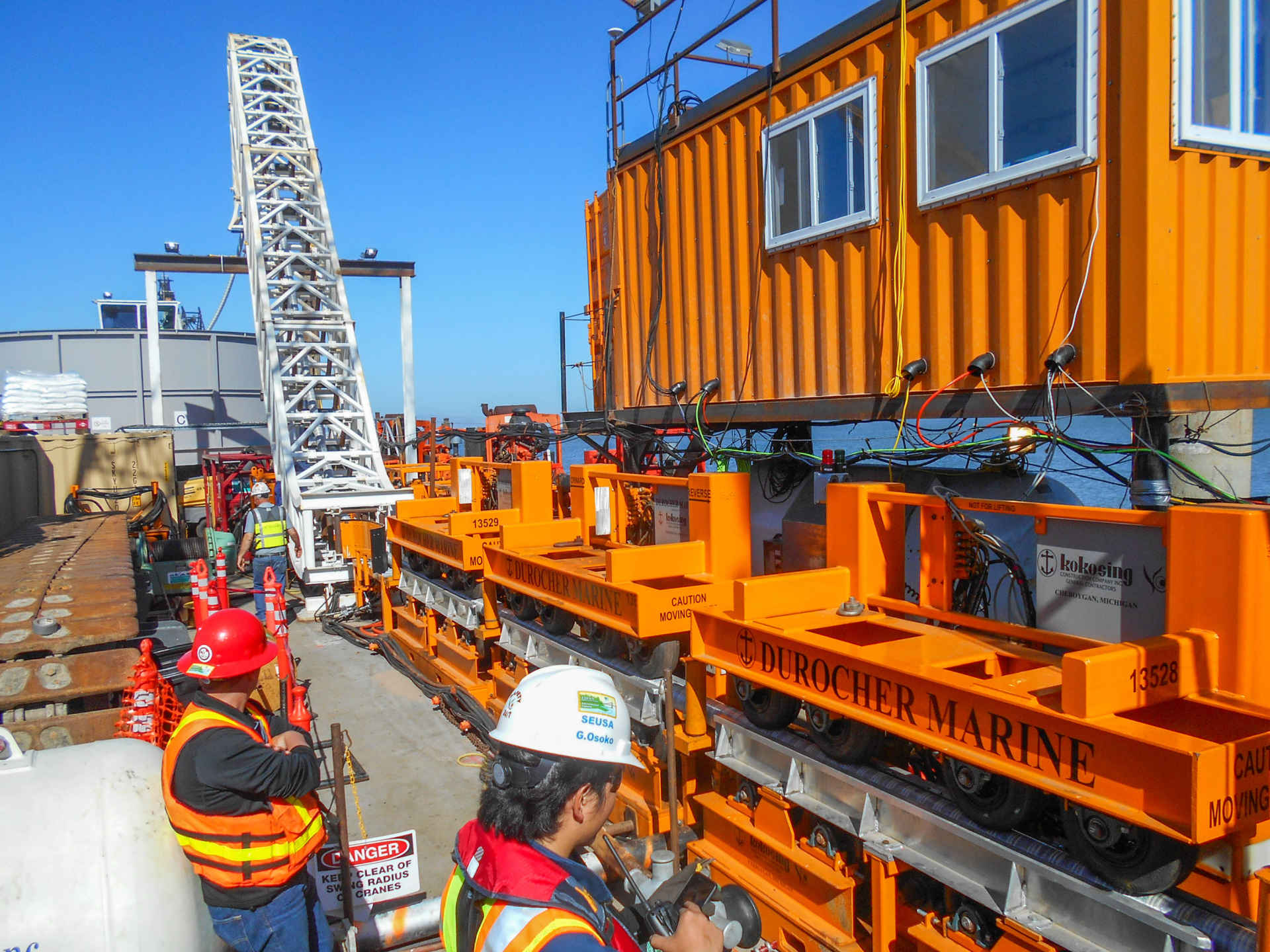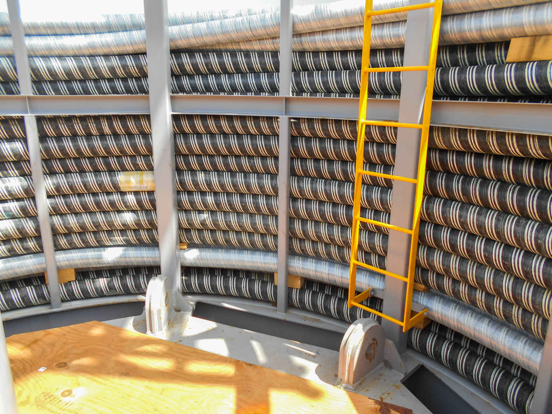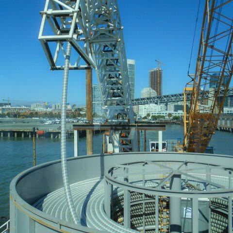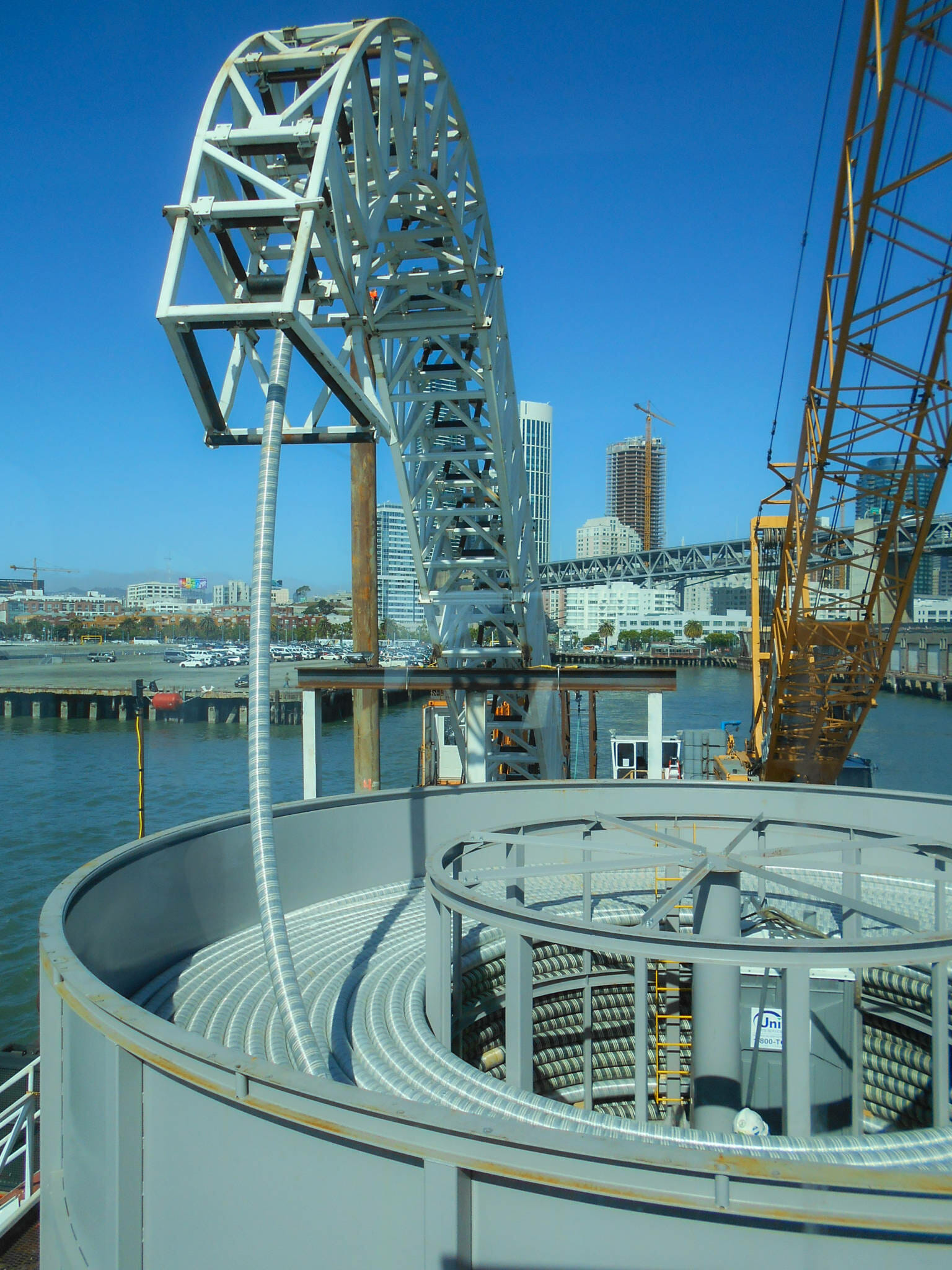 Sumitomo Electric subcontracted the subaqueous installation of the three 240kV transmission and fiber optic cables between the Potrero and Embarcadero Substations in downtown San Francisco. Prior to our arrival the owner installed three HDPE conduits at each substation. The conduits extend out from the harbor into 35 feet – 85 feet of water and were 1,000 feet and 1200 feet long. Ships from Japan delivered the three cables in individual tubs to the Port in San Francisco. Each tub weighed approximately 320 tons. After mobilizing our lay barge a single tub was set onto our 1,000-ton portable turntable. The lay barge moved into position and pulled the first power and fiber cable to the Potrero substation via the conduits. After the cable was secure the lay barge simultaneously laid and buried the 5-13/16-inch power cable and fiber optic cable with our water jet plow. Each lay route was a distance of 12,700 feet to the second conduit. At the second conduit the lay barge stopped, floated 2,100 feet of cable in a tidal zone, and winched the cables up the conduit to the Embarcadero Substation. The process was repeated two more times.