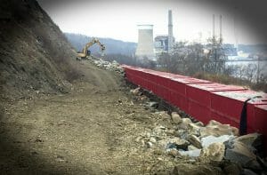 The material found in the hillside was generally sandstone or shale, which must be blasted before it can be excavated and hauled to the waste site. This operation inevitably sent material tumbling down the slope toward a catch area adjacent to the highway. Each blasting operation required stopping traffic and a detailed procedure to ensure explosives were detonated and all loose material was stable. As an additional precaution, Kokosing installed a 10-foot-wide by 12-foot-tall rock catchment wall at the bottom of the slope.